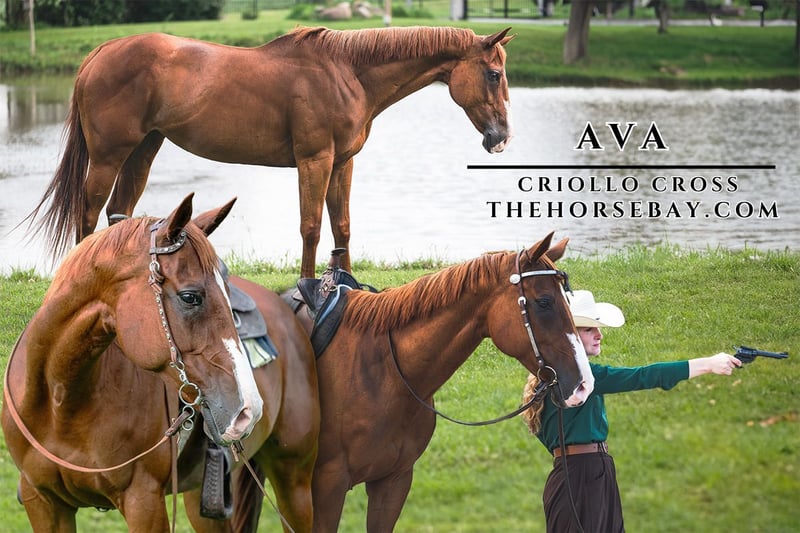 OPEN BIDDING ON THEHORSEBAY,COM. SALE ENDS ON 09/03 @ 6PM CT. More information is available on the website, including an UTD vet inspection, Coggins, video, images, and the owner's contact information to ask questions, request information, or make arrangements to come to visit. Ava is a rare beauty. She is a gorgeous 15.1 chestnut mare with lots of flashy white markings. She is part Criollo, an extremely rare breed to own in the U. S. Ava has had many hats in her life. She has competed in professional polo, completed several 25-mile endurance races, and trained for mounted shooting. She has had extensive pleasure riding training. Ava learned to neck rein and spin like the best of them from polo. As her training continued, she progressed to learn to give to the bit and collect herself in a slow and comfortable trot and lope. Ava will move off your leg to turn and has a great whoa. She will come to the mounting block or fence to mount, handle being shot off of, and even walk through smoke. While on the trail, she saw barking dogs, bikes, and even raging motorbikes and handled them easily. Ava has an amazing drive to work and is all heart. I know the next lucky person to have her will be extremely impressed with her training and enduring heart.