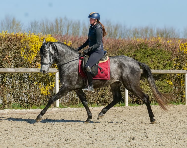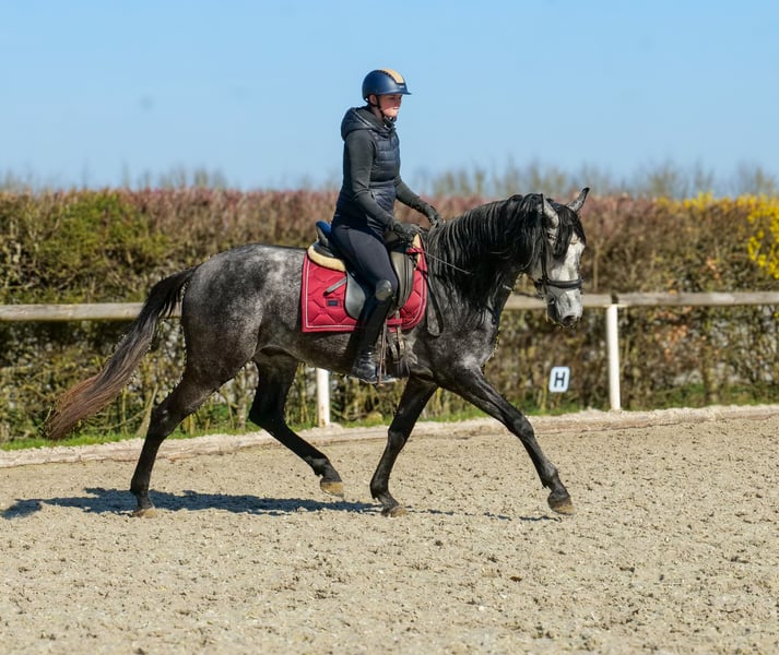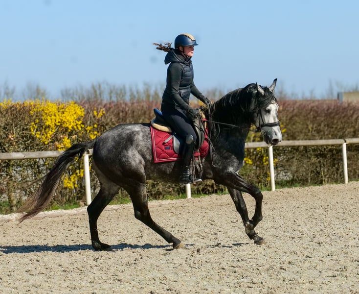 Name: Sanson-Sol Rasse: Cruzado (Kreuzung) Geschlecht: Wallach Geburtsdatum: 31.3.2022 Alter: 4 Stockmaß: 1.55m Farbe: Schimmel Abstammung: ohne Abstammungsnachweis Charakter: menschenbezogen, lernwillig, verlässlich, neugierig, intelligent, mutig, gelassen Ausbildung/Eignung: geritten, Bodenarbeit, Freizeit, Dressur, Barock, Working Equitation Geländeerfahrung: zuverlässig, unerschrocken, nervenstark, in der Gruppe Gesundheit: entwurmt, geimpft, Barhufer, ekzemfrei, Zähne kontrolliert, osteopathisch behandelt, wegen einem Befund, wird er weit unter Wert verkauft. Haltung: Box, Paddock Besonderheiten: gute Grundgangarten, sehr sitzbequem, schmiede und verladefromm, herdenverträglich Die genannten Eigenschaften beruhen auf unserer persönlichen Einschätzung und stellen keine zugesicherten Merkmale dar. Preis: 3500€ (Bruttopreis) Haben wir ihr Interesse geweckt? Um Ihnen einen besseren Eindruck von Sanson zu geben, senden wir Ihnen sehr gerne sein Reitvideo zu. Selbstverständlich stehen wir Ihnen für eine ausführliche Beschreibung des Pferdes, persönliche Beratung und zur Beantwortung aller Ihrer Fragen auch telefonisch zur Verfügung. Bitte schreiben Sie uns hierfür jederzeit eine WhatsApp Nachricht, oder rufen unter folgender Telefonnummer an: +49 15119487595 Unsere Telefonzeiten sind täglich von 7:00 - 13:30 sowie ab 20:00Uhr. Wir freuen uns über Ihre Kontaktaufnahme! Eine klinische oder Röntgenologische Ankaufsuntersuchung kann gerne vom Tierarzt Ihrer Wahl durchgeführt werden. Natürlich kann Sanson sicher und komfortabel in sein neues Zuhause geliefert werden. Wir kümmern uns um alle notwendigen Vorbereitungen und den Transport, damit Ihr neues Pferd stressfrei, gut betreut, versichert und wohlbehalten im neuen Zuhause ankommt. Zurzeit präsentieren wir eine sorgfältig ausgewählte Vielfalt an Verkaufspferden. Bei uns finden Sie garantiert Ihr Traumpferd. Besuchen Sie uns auch gerne auf unserer Homepage unter: www.marvinsroyalhorses.de. Sehr geehrte Kunden, gerne stellen wir Ihnen unsere Pferde vor und führen, putzen, satteln, longieren, Bodenarbeit sowie Probereiten in der Reithalle, auf dem Platz oder im Gelände ist Ihnen möglich, um Ihr neues Familienmitglied näher kennenzulernen. Dieses kostet für ein Pferd 40€, für jedes weitere 30€ und wird beim Kauf wieder erstattet. Unsere Adresse lautet: Grube Ferdinand 50 53577 Neustadt Wied Google Maps: marvinsroyalhorses