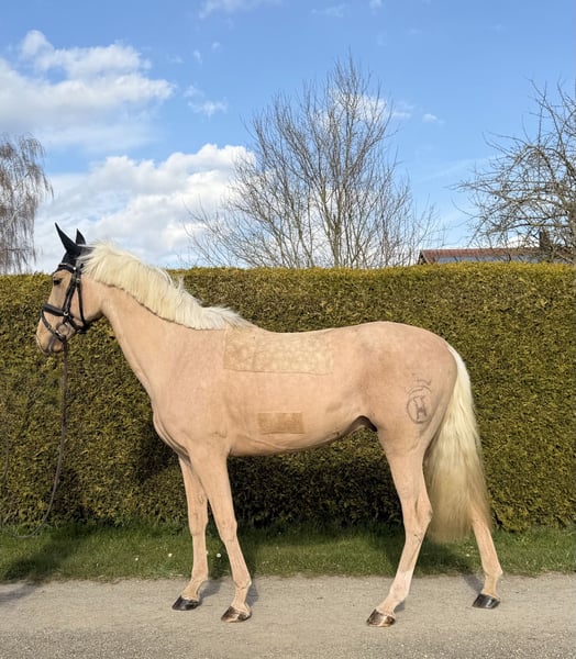 Wallach, 4-jährig, ca. 153 cm Ein echter Mädchentraum - sehr liebes, unkompliziertes Pferd mit angenehmem Charakter und schöner Ausstrahlung. Mit seiner wunderschönen Farbe ein echter Hingucker - ein wahrhaftiges „Barbie-Pferd". Ein Pferd, mit dem man gemeinsam wachsen, zusammenwachsen und sich weiterentwickeln kann - ideal auch für Ponyumsteiger, die sich ihr Pferd selbst ausbilden möchten. Bereits gesprungen, dabei nicht guckig am Sprung, ehrlich und sehr brav. Lässt sich angenehm reiten und gibt ein sicheres Gefühl - auch für ein Mädchen. • Im Gelände: alleine sowie in der Gruppe problemlos reitbar. Im Umgang absolut unkompliziert: brav beim Schmied • brav beim Tierarzt • verladefromm & fährt sicher Anhänger • nicht schreckhaft • Zusätzlich: beherrscht Tricks (z. B. Hinlegen) • TÜV vorhanden (ohne Befund) • Frisch gemacht (Impfung, Zahnarzt, geschoren) 11.000 € VHB Standort: Bayern Videos gerne per PN