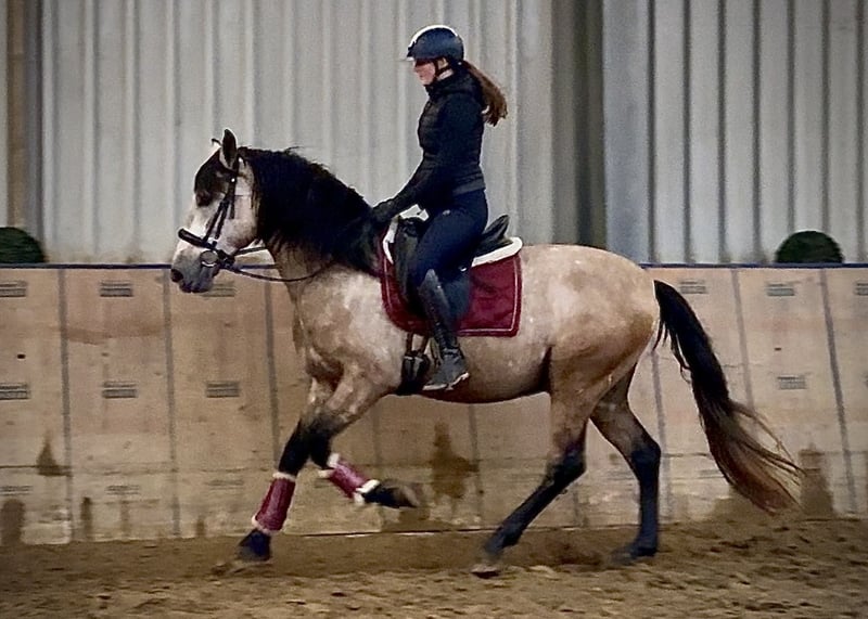 Name: Choto Rasse: Andalusier Mix Geschlecht: Wallach Geburtsdatum: 21.06.2021 Alter: 4 Stockmaß: 1.58m Farbe: Falbschimmel Abstammung: nicht bekannt Charakter: lernwillig, verlässlich, neugierig, intelligent, sensibel Ausbildung/Eignung: geritten, Dressur, Freizeit, Working Equitation Geländeerfahrung: zuverlässig, unerschrocken, alleine und in der Gruppe Gesundheit: entwurmt, geimpft, Barhufer, ekzemfrei, Zähne kontrolliert, ostheopatisch behandelt Haltung: Box, Offenstall Besonderheiten: sehr sitzbequem, schmiede und verladefromm Die genannten Eigenschaften beruhen auf unserer persönlichen Einschätzung und stellen keine zugesicherten Merkmale dar. Preis: 7900€ (Bruttopreis) Haben wir ihr Interesse geweckt? Um Ihnen einen besseren Eindruck von Choto zu geben, senden wir Ihnen sehr gerne sein Reitvideo zu. Selbstverständlich stehen wir Ihnen für eine ausführliche Beschreibung des Pferdes, persönliche Beratung und zur Beantwortung aller Ihrer Fragen auch telefonisch zur Verfügung. Bitte schreiben Sie uns hierfür jederzeit eine WhatsApp Nachricht, oder rufen unter folgender Telefonnummer an: +49 15119487595 Unsere Telefonzeiten sind täglich von 7:00 - 13:30 sowie ab 20:00Uhr. Wir freuen uns über Ihre Kontaktaufnahme! Eine klinische oder Röntgenologische Ankaufsuntersuchung kann gerne vom Tierarzt Ihrer Wahl durchgeführt werden. Natürlich kann Choto sicher und komfortabel in sein neues Zuhause geliefert werden. Wir kümmern uns um alle notwendigen Vorbereitungen und den Transport, damit Ihr neues Pferd stressfrei, gut betreut, versichert und wohlbehalten im neuen Zuhause ankommt. Zurzeit präsentieren wir eine sorgfältig ausgewählte Vielfalt an Verkaufspferden. Bei uns finden Sie garantiert Ihr Traumpferd. Besuchen Sie uns auch gerne auf unserer Homepage unter: www.marvinsroyalhorses.de. Sehr geehrte Kunden, gerne stellen wir Ihnen unsere Pferde vor und führen, putzen, satteln, longieren, Bodenarbeit sowie Probereiten in der Reithalle, auf dem Platz oder im Gelände ist Ihnen möglich, um Ihr neues Familienmitglied näher kennenzulernen. Dieses kostet für ein Pferd 40€, für jedes weitere 30€ und wird beim Kauf wieder erstattet. Unsere Adresse lautet: Grube Ferdinand 50 53577 Neustadt Wied Google Maps: marvinsroyalhorses