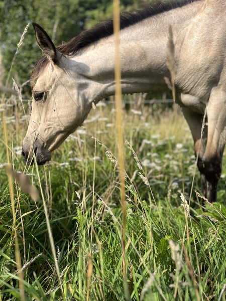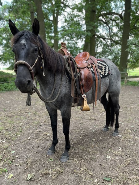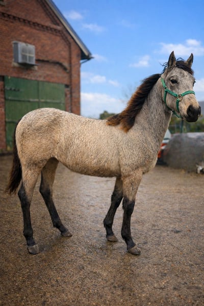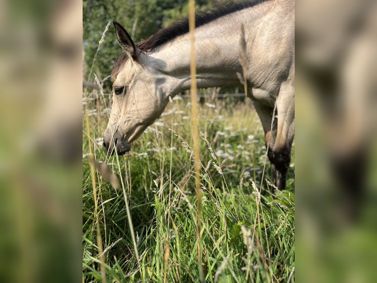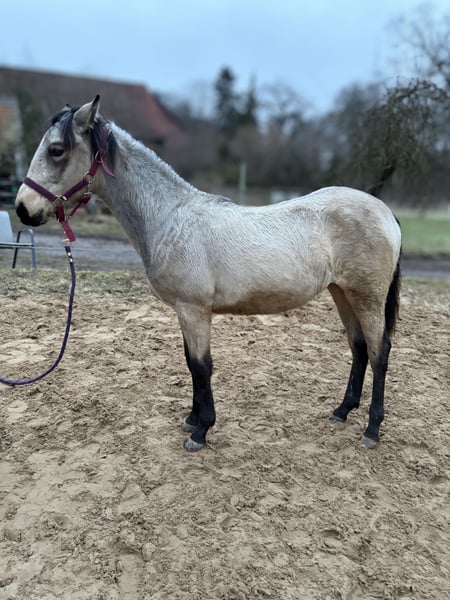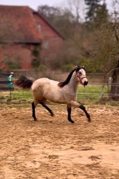 Ich biete hier eine junge Buckskin Quarter–Lusitano-Stute (Azteka-Typ) an, die im April ein Jahr alt wird. Sie stammt aus einer Blue-Roan Foundation-Quarter-Horse-Stute aus der Hancock-Linie. Die Mutter (Stkm 1,55m) ist freundlich im Umgang, sehr rittig und klar im Kopf und kann vor Ort besichtigt werden. Ihr Vater ist ein cremellofarbener Lusitano (Stkm. 1,54 m) der Ausdruck, Präsenz und Qualität in der Bewegung mitbringt. Die junge Stute zeigt sich aufmerksam, selbstbewusst und mit einer schönen inneren Stabilität. Sie bringt eine gute Mischung aus Ruhe und Reaktionsfähigkeit mit und wächst artgerecht in der Herde auf. Perspektivisch sehe ich sie in der Working Equitation, in der altkalifornischen Reitweise oder auch in der Rinderarbeit. Ebenso kann ich sie mir bei einem ambitionierten Freizeitreiter vorstellen. Aktuell kennt sie das Fohlen-ABC, kennt Hunde, Trecker, Kettensägen und verschiedene Planen. Sie ist schmiedefromm, regelmäßig entwurmt und vollständig geimpft. Die letzten Bilder zeigen ihre Eltern. Bei ernsthaftem Interesse freue ich mich über eine persönliche Nachricht.