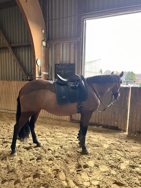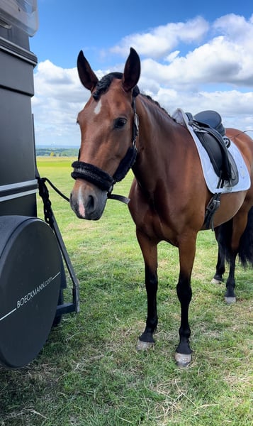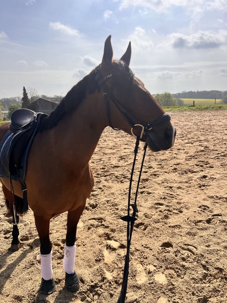 With a heavy heart, I am looking for a new home for my mare due to lack of time. I bought her as a three-year-old, just backed, and trained her together with my trainer up to Elementary dressage. It was very important to me that she always has enough time, which is why we only competed in class E this year — successfully. She is an absolutely level-headed, honest, and incredibly people-oriented horse. She remains calm in new situations, pays attention, and trusts her handler. Despite her gentle nature, she sometimes needs a clear, loving hand to guide her. She is always motivated in work, learns quickly, and enjoys hacking out. Even children or less experienced riders can handle her wonderfully. She loads onto the trailer without issue and remains calm in new environments, whether at competitions or in unfamiliar terrain. I wish for my Candy to find a home where she is considered a family member, just as she is with me. I can very well imagine her as a children's pony or as part of a mother-daughter pair. I am not looking for a sports stable or a dealer but for her person — someone who sees her with their heart. A home where she is seen, understood, and simply allowed to be a horse — whether as a leisure partner, family horse, or beloved companion. If genuinely interested, I am happy to share more about her background and send current videos. I hope to find someone who sees her with their heart — she truly deserves it. A veterinary health check (AKU) is of course possible. For an additional fee, her saddle and equipment can also be purchased. A trial ride costs €35, which will be deducted from the purchase price. Price is secondary to finding the right home.