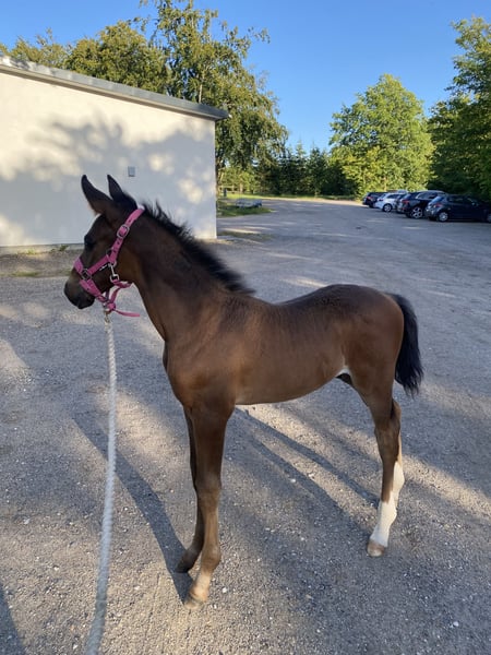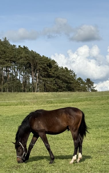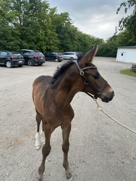 Billy is a handsome and well-developed young stallion, born on 01/07/2024. He is expected to mature to around 168–170 cm. He has top dressage bloodlines: • Sire: Be Sure – a modern stallion known for rideability, capacity, and elegant conformation. • Dam’s sire: Rotspon – a renowned Hanoverian stallion who has produced rideable and successful dressage horses all over the world. Billy is sweet, gentle, and easy to handle. He is handled daily and knows everything a yearling should: he leads, ties, lifts his feet, etc. He is well-socialized and works nicely in everyday routines. He is currently in a young stallion group and thrives well in the herd. Up to date on everything: deworming, vaccinations, and regular farrier visits. A promising young horse for the rider looking for quality, good temperament, and strong breeding. Due to a farrier error, he was operated on left front leg as a foal (contracture/ naviculitis) The procedure was uncomplicated, and he now stands correct. For sale only due to lack of time. Home more important than price. Located in Denmark.