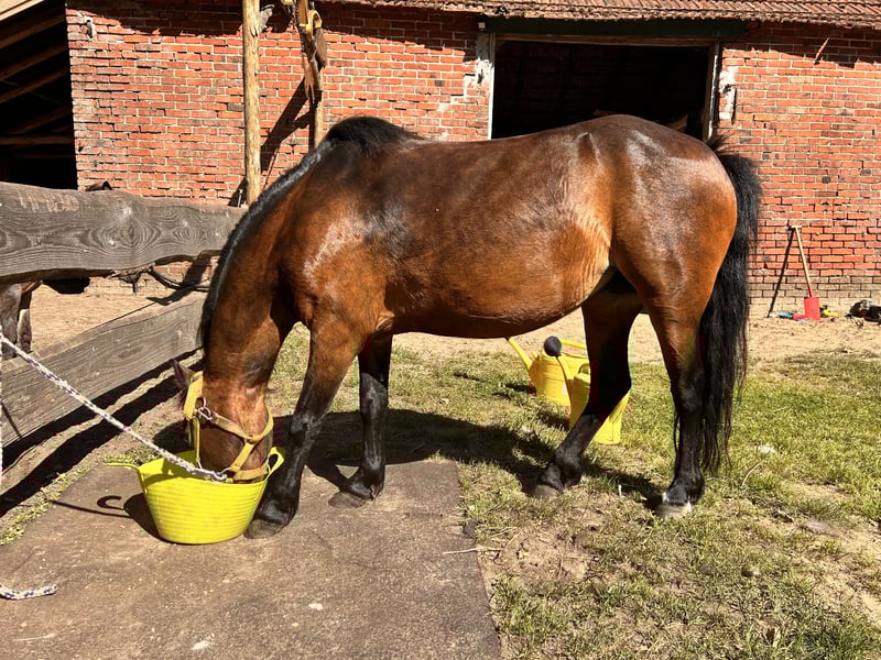For sale is our sweet "Sunny Day." Sunny Day was born in 2011 and is a Dartmoor Pony mare with a pedigree. Her height is approximately 4 feet (120 cm). She has previously been used as a broodmare and has produced several beautiful foals. Currently, she is in transition to becoming a leisure pony and shows a strong willingness to learn. She can be somewhat wary of strangers, but once she knows someone, she handles everything well. Sunny Day is accustomed to being groomed, cuddled, and led by children, and she is always well-behaved in these situations. She is happy to give all four hooves and stands patiently for the farrier. Her training as a riding pony still needs to be further developed. So far, she is familiar with a saddle, bridle, lunging, and riding in the arena at walk and trot. She has even been out in a group on a trail ride and behaved impeccably. We will continue working on her aids and are confident she can become a wonderful children's pony. There are a few things she still needs to practice, such as lunging on the right rein and calming down from hectic movements by adults. Sometimes, these can be a bit overwhelming for her. Of course, she could also be used for breeding again. She is regularly dewormed, has been checked by the farrier, and lives in a paddock with a mixed herd, with whom she gets along well. Her teeth have been checked and are in good condition. If you think Sunny Day might be a good match for you, please feel free to contact us and get to know her. I am selling Sunny Day on behalf of the owner. She is located in Meppen-Teglingen.