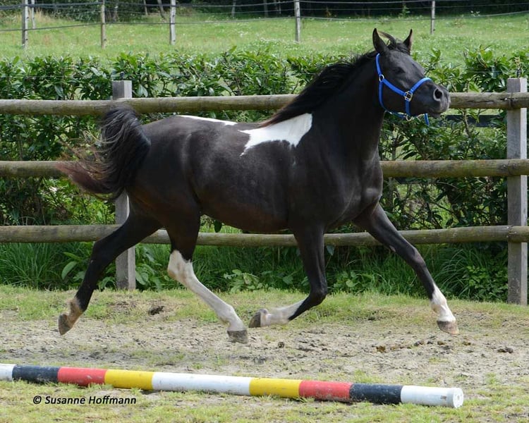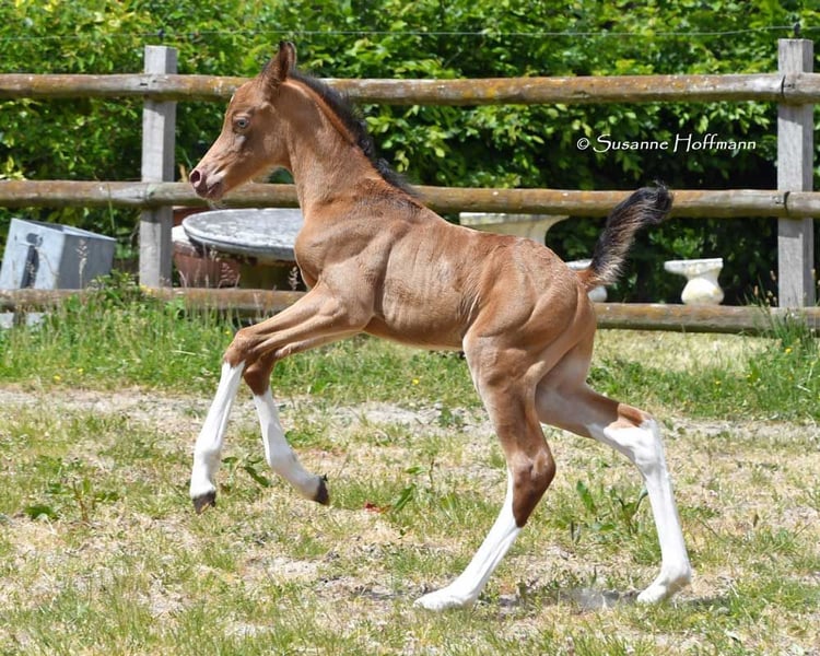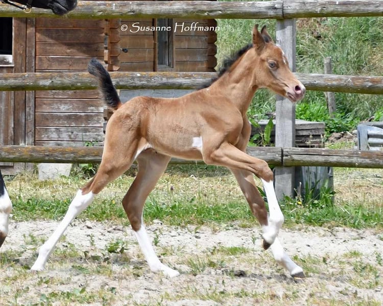 Our Candyman is an absolute eye-catcher and something very special, not only because of his rare, golden champagne color and minimal spotting, but also because he impresses with his wonderful type and top-notch movements. This is why he has also been highly awarded, including a score of 9 for type. We would love to see him as a family horse or also in sports, for example in endurance. Because we are sure that he will make his way here, as he comes from very rideable, performance-oriented lines. The pictures show him a few days old, followed by a few pictures of his mother and then of his father.