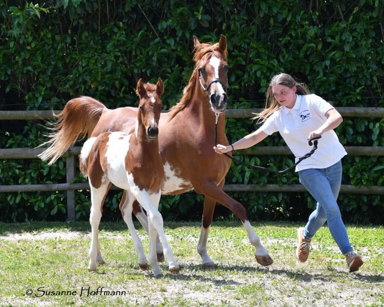 Our Levanto is an Arabian Partbred colt who, in addition to his Arabian charm, particularly impresses with his excellent riding horse qualities. He is also a dream in terms of character, very cooperative and people-oriented, and super curious. In his movement, he shows himself to be very balanced and spacious, with not too much upward thrust, which makes him particularly interesting for endurance riding, but leisure riders also appreciate comfortable movements. The pictures show him just a few days old, and then about 6 weeks old during the inspection appointment. Following that is a photo of his mother and finally some pictures of his father, the USA-imported Pintabian performance stallion SH Secret Legacy. Feel free to make an appointment with us to meet this wonderful boy and our other foals.