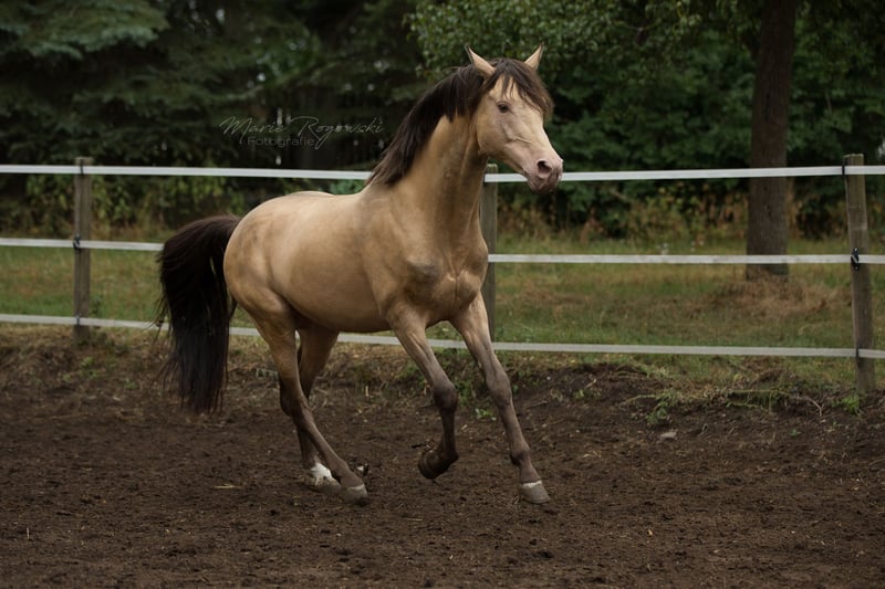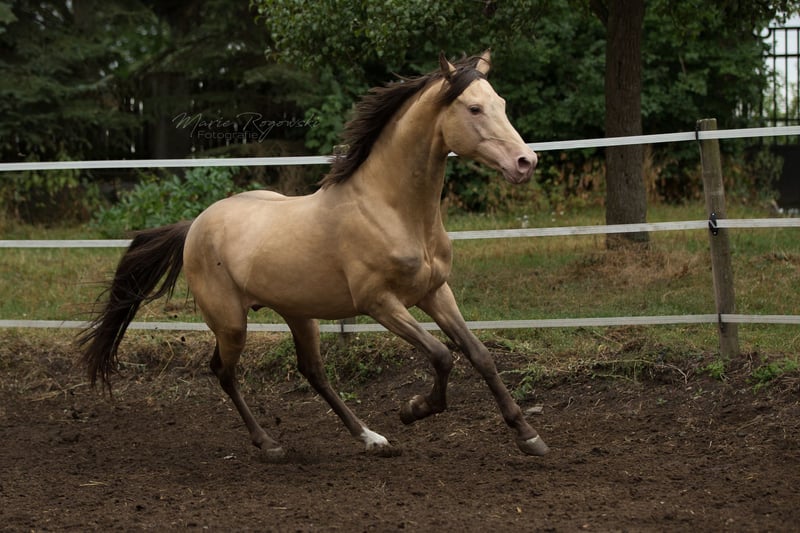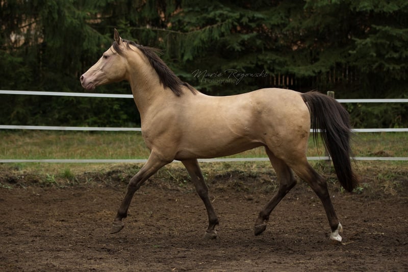 Partbred arabe | Amber Champagne | 2005 | 148 cm 87,5 % de sang arabe | Approuvé par l'ECHA-ESV (8,1 – HB I) Test de performance des étalons de 30 jours 2014, Neustadt/Dosse Génétique de la couleur : EE Aa Ch/n Testé génétiquement : SCID, CA, WFFS et PSSM2 – négatif Khalvados GF est un étalon compact, sportif, avec une rare robe ambre champagne et une forte proportion de sang pur. Il est sociable au quotidien, clair dans sa tête et facile à monter. Sa volonté de performance et son caractère amical ont été notés à plusieurs reprises 8,0 lors du test de performance des étalons. Du côté paternel, il descend de Khalvin Khlein KpM, le premier étalon arabe champagne approuvé au niveau mondial. Sa mère Muhida, une fille AV noire de jais issue du Hägerhof, apporte des lignées performantes via El Aswad et Farouk. Son pedigree combine des lignées égyptiennes, polonaises et américaines éprouvées avec un fort potentiel sportif et une grande diversité génétique. Khalvados GF est utilisé pour l'amélioration de l'élevage de poneys, de petits chevaux ou de chevaux part-bred. Sa descendance est présente dans le monde entier.