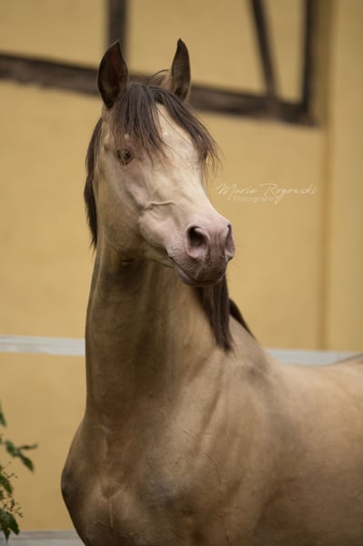 Arabian Partbred | Amber Champagne | 2005 | 148 cm 87.5% Arabian blood | Approved by ECHA-ESV (8.1 – HB I) 30-day stallion performance test 2014, Neustadt/Dosse Colour genetics: EE Aa Ch/n Genetically tested: SCID, CA, WFFS and PSSM2 – negative Khalvados GF is a compact, athletic stallion with a rare amber champagne colouring and a high percentage of thoroughbred blood. He is easy-going, clear-headed and rideable in everyday life. His willingness to perform and friendly character were rated 8.0 several times in the stallion performance test. On his sire's side, he descends from Khalvin Khlein KpM, the first Champagne Arabian stallion to be licensed worldwide. His dam Muhida, a jet-black AV daughter from Hägerhof, brings performance-tested bloodlines via El Aswad and Farouk. The pedigree combines proven Egyptian, Polish and US lines with high athletic potential and genetic diversity. Khalvados GF is used for refinement in pony, small horse or partbred breeding. His offspring are represented worldwide.