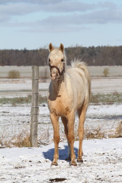 MSA Nadim *Prämienfohlen 2023* Partbred Araber 95,95 % AV Palomino geboren 31.03.2023 z.Zeit 154 cm Geschlecht: Wallach MSA Nadim ist ein vielversprechender Arabisch Partbred Wallach aus hochwertiger, leistungsgeprägter Anpaarung. Er verfügt über einen ox-Anteil von 95,95 %. Sein Vater ist der Vollblutaraberhengst Osborne ox, seine Mutter die Arabisch Partbred Stute Sweet Fairy in der Farbe Smoky Black Schecke. Nadim präsentiert sich in der seltenen Farbe Fuchsisabell (Palomino) und überzeugt durch ein edles, harmonisches Exterieur mit klarer arabischer Ausstrahlung. Er wurde mit der Fohlenprämie ausgezeichnet. Charakterlich zeigt er sich sehr souverän, freundlich und ausgeglichen. Er ist regelmäßig entwurmt und gegen Tetanus geimpft. Er kennt er den Longiergurt und wurde vorsichtig anlongiert. Verladen, Schmied sowie alltägliche Abläufe eines landwirtschaftlichen Betriebs ( Traktoren, Kühe usw.) sind ihm vertraut. Auch in neuen Situationen bleibt er ruhig, aufmerksam und kopfklar. Derzeit misst er etwa 1,54 m Stockmaß und ist altersgemäß korrekt entwickelt. Er befindet sich in artgerechter Aufzucht und bringt sehr gute Voraussetzungen als zukünftiges Sport- oder Freizeitpferd mit. Weitere Informationen werden bei ernsthaftem Interesse gern zur Verfügung.