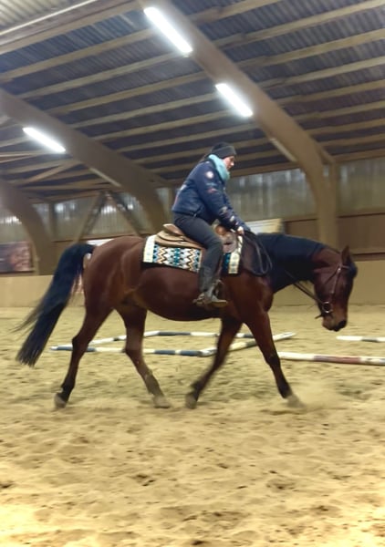 ⚜️Herzensangelegenheit⚜️ ,,Theo“ - Pintoaraber/ Reitpony Mix - Geb. 03.07.2020 - Stockmaß: 153 cm - Mutter: Louise – Reitpony - Vater: Taza Bajan (Leistungshengst) – Pintoaraber - AKTUELLE AKU liegt vor . - 3-monatige Westerngrundausbildung beim Profi, MJ Performance Horses/ Michael Jahnke (Januar 2024 bis Anfang April 2024) - seit Juni 2025 wieder im Profiberitt bei Belle Air Quarter Horses Theo wuchs bis 2,5-jährig bei seinem Züchter, sehr familiär und unter besten Voraussetzungen auf. Danach kam er zu seiner jetzigen Besitzerin, die sich schon als Fohlen in ihn verliebt hatte. Hier wurde er im Dezember 2022 kastriert. Bevor Theo eingeritten wurde, war die Besitzerin viel mit ihm im Gelände spazieren und das hauptsächlich allein. Er wurde von Anfang an, beim Züchter und seiner Besitzerin, immer gehegt und gepflegt. Theo ist ein bildhübscher, stämmiger Kuschelbär (aber kein Gewichtsträger!). Er ist im ganzen Umgang, beim Schmied (4-fach beschlagen), Tierarzt und beim Verladen, absolut unkompliziert. Er ist sehr sozial anderen Pferden gegenüber, immer freundlich und offen. Theo kam zu uns zur weiteren Ausbildung, da er aufgrund von Zeitmangel ca. 5 Monate sein Leben auf der Koppel genossen hat (wurde aber trotzdem täglich gehändelt und verpflegt ). Er ist super lernwillig und mag die Arbeit und Abwechslung. Wir hatten allerdings im Training gemerkt, dass er nicht so gute Fortschritte machte und immer wieder „Probleme“ zeigte, sich tragen und über den Rücken zu arbeiten. Daraufhin haben wir ihn röntgen lassen, wo leider herauskam, dass seine Dornfortsätze nah beieinander liegen. Um alles auszuschließen, liegen auch Röntgenbilder der Sprunggelenke vor. Seitdem trainieren wir Theo spezifischer, mit dem Augenmerk Rückenaufbau vom Boden, aber auch von oben. Er ist beim Reiten brav und zeigt keine Unarten. Nach seiner Grundausbildung ging er hauptsächlich mit seiner Besitzerin ins Gelände und das überwiegend allein. Durch seinen Befund ist es uns sehr wichtig eine Person zu finden, die sich wirklich mit ihm beschäftigt, Erfahrungen hat und ihn weiter fördert, nur dann wird man langfristig viel Freude mit ihm haben können. Jemand der auch Erfahrung und Spaß an der Bodenarbeit hat und sich mit ihm auch weiterbilden oder auch zu Kursen fahren möchte. Theo ist, wenn er einmal Vertrauen und Sicherheit gefasst hat, ein absoluter Kumpeltyp und Herzenspferd, der einen dann immer freudig begrüßt, sobald man in den Stall oder auf die Koppel kommt. Er kennt bis dato nur 24/7 Heu / nachts in der Box und Tagsüber auf der Weide und auch nur mit Wallachen (Stuten nicht getestet). Wir können uns auch vorstellen, das Theo in einem kleinen, gut geführten Offenstall mit beständiger Herde, sich wohlfühlen würde. Seine Besitzerin gibt ihn nur ab, weil sie Theo nicht das Training bieten kann, was er benötigt und ihn auch dahingehend nicht so fördern kann, wie er es brauch. Es fällt ihr unheimlich schwer und deswegen suchen wir für ihn das absolute 5 Sterne zu Hause, mit Familienanschluss, wo er genauso geliebt, gehegt und gepflegt wird, wie es bis jetzt der Fall war. Video : https://youtube.com/shorts/I7FU4-czJ4w?si=eZ1-XxykAwGo99B_ Für ein Probereiten nehmen wir uns gerne Zeit & berechnen 40€ .