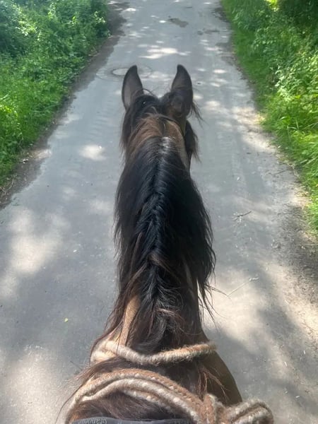 If everything fits, I am offering my 9-year-old part-bred Arabian mare in buckskin color for sale. She is a very refined horse, and I have only ridden her bitless so far. We have done a lot of groundwork and natural horsemanship. Otherwise, we mainly rode in the outdoors for leisure. I have also used her occasionally for therapeutic work. She can be very relaxed, but also as typical for Arabian horses, spirited and energetic. She also has the "turbo gait," meaning she is very fast and enjoys moving. She has always been kept in an open stall with me, and I would like this to continue for her. However, she needs a secure dry shelter, as she tends to be lower in the herd hierarchy and does not like standing in the rain. Alternatively, a paddock-box at night and pasture during the day would also be suitable for her. She is barefoot (I put hoof boots on her for rides in front) and has no problem with her hooves being handled. She has been regularly vaccinated, dewormed, and had her teeth checked annually. She also receives osteopathic treatment once or twice a year. Due to her generally high body tension, I occasionally give her small massages while grooming. Even if she can get quite lively, she is always very manageable on a long lead rope. Most recently, she was in a mare herd, but she is also familiar with mixed herds. She is not a heavy weight carrier; I would say she can comfortably carry up to 70 kg. I am only placing her in the best hands – this is not an emergency sale. She is also likely to pass on many different color genes. The last picture shows her sire, Paintabian "Shicco Ibn Shai." I have a specially fitted Deuber Jerez saddle in size S2 (Bückeburg model) for her, which can be purchased separately.