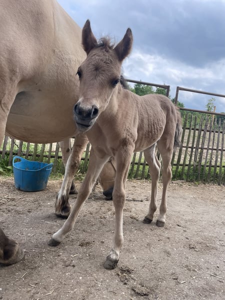 Der dunkle Fohlen heißt Djuna und ist die Tochter von Kalla, einer Fjordpferdestute von Anton. Der Vater ist EA Jameel, ein schwarzer arabischer Vollbluthengst. Djuna besitzt vollständige NRPS-Papiere, ist kräftig gebaut und bewegt sich wunderbar. Sie wird etwa 1,45 m groß werden und ist durch ihre breite Fjord-typische Konstitution auch als zukünftiges Reitpferd für Erwachsene geeignet. Da ihr Vater schwarz ist, kann Djuna später auch schwarze oder Grullo-Fohlen bekommen. Das helle Fohlen heißt Doebai, ihre Mutter ist Baika, meine kleine (1,40 m) Arabermischlingsstute. Der Vater ist der Fjordhengst Loebas. Doebai ist ein unglaublich liebes, sanftes Stutfohlen, umgänglich und sehr menschenbezogen. Sie besitzt NRPS B-Register-Papiere. Sie ist robust gebaut mit auffallend langen Beinen und wird deutlich größer als ihre Mutter, mindestens 1,45 m, und durch ihre Konstitution auch gut für Erwachsene geeignet. Doebai ist selbst wildfarben (Fuchs), ihre Mutter ist Grullo, sodass sie später ebenfalls Grullo-Fohlen bekommen kann. Es besteht die Möglichkeit, dass sie homozygot wildfarben ist. Die Mutter von Doebai könnte bei passendem Zuhause ebenfalls umziehen. Sie ist freizeitmäßig geritten, leicht im Umgang, wird problemlos tragend und ist eine liebevolle Mutter. Die Fohlen wachsen hier in einer Stutengruppe auf unserem Hof auf und haben dadurch schon einiges erlebt. Sie leben 24/7 draußen, sind kerngesund, an Kinder gewöhnt, kennen auch Traktoren und Gabelstapler und sind sozial in der Gruppe. Ab Februar können sie wir erwarten, wiraning sie dann 8-9 Monate alt sind, abgegeben werden. Die Mütter und die große Schwester von Djuna sind ebenfalls hier zu besichtigen. Ich stehe auch im Kontakt mit den bisherigen Fohlen dieser Stuten. Ein gutes Zuhause ist mir sehr wichtig! Ich verlange 2.500 Euro pro Fohlen. Wenn sie gemeinsam ein gutes Zuhause finden, lässt sich darüber noch verhandeln. Außerdem habe ich noch ein Welsh A-Stutfohlen (siehe letzte Fotos) zur Verfügung.