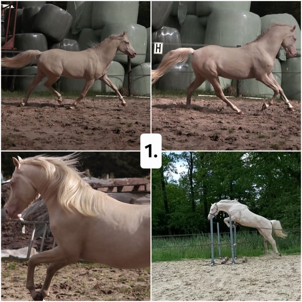 Auf der Suche nach einem 5-Sterne-Pferd 🏡 Nr. 1 und Nr. 2 ebenfalls zum Verkauf. Bitte lesen Sie die Anzeige sorgfältig durch. Außergewöhnlich luxuriöse Palomino-Partbred-Araberstute. Breezer ist eine hübsche Stute mit einem beeindruckenden Erscheinungsbild. Bei der Zuchtschau waren sie sofort begeistert von ihr, vor allem von ihrem schönen Kopf! Sie erhielt zudem eine schöne Erstprämie. Sie hat beeindruckende 90 % Araberblut und kann hervorragend gehen! Sie stammt von der edlen Partbred-Araberlinie Fizz Silver Fame x Topvererber PSYTADEL ab. Eine wertvolle Blutlinie mit zahlreichen Championaten. Breezer ist leicht zu handhaben und kommt gut mit anderen Stuten zurecht. Sie ist derzeit 2,5 Jahre alt und wird voraussichtlich 1,55 m groß. Negativ getestet auf: SCID LFS CA HWSD PSSM1 WFFS HYPP Breezer weist keine (Haltungs-)Mängel auf. Sie wurde stets regelmäßig entwurmt, geimpft und fachmännisch beschlagen. Bei Interesse senden Sie bitte eine private Nachricht. Sie kann gegen Aufpreis bis zu ihrem dritten Lebensjahr hier bleiben und ausgebildet werden. Für ein Video schicken Sie eine Nachricht an 0611058871. Auch zum Verkauf: 1. ♂️ Cremello 1,48 m 6 Jahre Unter dem Sattel Fizz Silver Fame x Leunsvelds Yrian Erstprämie 2. ♀️ Cremello 1,45/1,48 m 2,5 Jahre Fizz Silver Fame x Leunsvelds Yrian Erstprämie