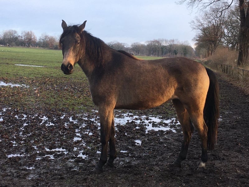 Wenn Alles passt, biete ich meine 9 jährige Partbred Araber Stute in der Farbe Buckskin zum Verkauf an. Sie ist ein sehr feines Pferd und ich bin sie bisher nur gebisslos geritten. Wir haben viel Bodenarbeit und Natural Horsemanship gemacht. Ansonsten sind wir in erster Linie freizeitmäßig im Gelände unterwegs gewesen. Ich habe sie auch hin und wieder für die therapeutische Arbeit eingesetzt. Sie kann tiefenentspannt sein, allerdings genauso arabertypisch temperamentvoll. Und sie hat auch den „Turbogang“, soll heißen, sie ist sehr schnell und bewegt sich gerne. Bei mir stand sie immer im Offenstall und das würde ich mir für sie auch weiter wünschen. Sie braucht allerdings einen sicheren Platz im trockenen Unterstand, da sie tendenziell rangniedrig ist und gar nicht gerne im Regen steht. Alternativ wäre nachts Paddock-Box und tagsüber Weide sicher auch ok für sie. Sie läuft barfuß (vorne zieh ich ihr für Ausritte Hufschuhe an) und lässt sich ohne Probleme die Hufe bearbeiten. Sie wurde regelmäßig geimpft, entwurmt und die Zähne jährlich gemacht. Ein- bis zweimal im Jahr bekommt sie eine ostheopatische Behandlung. Da sie tendenziell eine hohe Körperspannung hat, gebe ich ihr gelegentlich während des Putzens kleine Massagen. Auch wenn sie ordentlich aufdrehen kann, ist sie zu jedem Zeitpunkt am langen Strick supergut zu halten. Bei mir stand sie zuletzt in einer Stutenherde. Sie kennt aber auch gemischte Herden. Sie ist keine Gewichtsträgerin. Ich würde sagen bis maximal 70 kg kann sie gut tragen. Ich gebe sie nur in beste Hände ab – es ist kein Notverkauf. Sie kann wohl auch viele verschiedene Farbgene vererben. Auf dem letzten Bild ist ihr Vater, Paintabian "Shicco Ibn Shai" Ich habe für sie einen extra angepassten Deuber Jerez in Größe S2 (Bückeburger Modell), der separat dazu erworben werden kann.