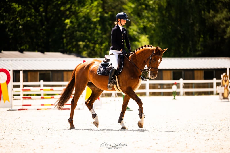 Sprzedam 9 letnia klacz Prosto od hodowcy Doświadczona w skokach do kl. P Ujeżdżenie do kl. C Przyjemna do jazdy, bezpieczna, jeżdżona tylko przez kobiety! Równa i delikatna na pomocach, poradź sobie z nią dziecko oraz amator. Bardzo lubi skakać Chodzi w tereny i na padok. Zdrowa, kuta na przód. Bez problemu jeździ przyczepą, małym koniowozem czy ciężarówką do wszystkiego wsiada bez problemu.