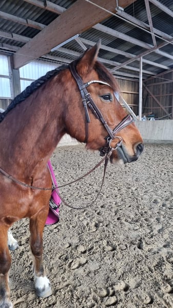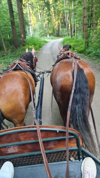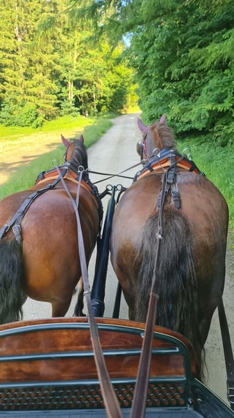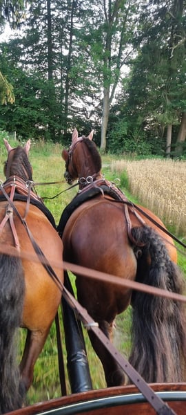 Eddie Enzo Freiberger Gelding Born in 2015 Barefoot Currently kept in a herd stall Height: 152 cm In mid-2023, we purchased a second Freiberger from a riding school for my partner (a beginner rider). However, he is not suitable for beginners, as he tends to buck. We had him thoroughly examined (blood tests, X-rays, gastroscopy, PSSM type 1 and 2 including muscle biopsy), but no findings were made (a single mild ringbone without clinical relevance, supported by a veterinary report). Since his arrival, he has been professionally driven in 2023 (single and pair harness). I only drive him in a two-wheel cart on the left rein, where he performs very well—happy and engaged. However, I do not ride him often enough to give him sufficient exercise (which is why he is currently quite overweight). He is driven almost daily in the lunging arena and, despite his figure, has excellent stamina. Additionally, I have re-established lunging training with him, as well as load training, etc. He is familiar with ground work and enjoys it. Initially, I also rode him outside, but I felt like I was on a ticking bomb. Since the beginning of 2024, he has not been ridden. Before coming to us, he had different riders, was regularly exercised outside, and also jumped. He also participated in pony club activities with very young children. Character-wise, he is a cuddler, gentle with children, affectionate, but sometimes a nervous bundle of energy for no apparent reason. I am selling him as a carriage horse. He can certainly be ridden (he has excellent basic gaits), but his strength and preference lie in driving. As a riding horse, I find him too "unpredictable." I wish for him to be kept in a herd stall or at least outside with the herd during the day (he is not very familiar with stabling) and to have more movement and interaction than I can currently provide. He is regularly vaccinated, dewormed, and his teeth are checked annually (most recently two weeks ago). Please feel free to contact me with any questions.