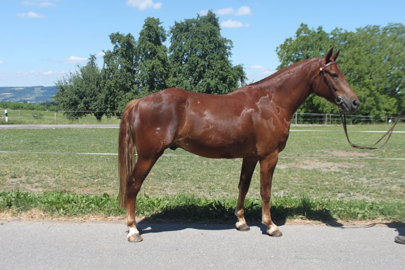 Wallach, Fuchs, 153 cm, 3 einhalb jährig Der 3 einhalbjährige Wallach wird schon seit längerem für geführte Ausritte im Gelände eingesetzt - hier kann er von Kindern, Jugendlichen und auch unsicheren Reitern geritten werden. Auch alleine ausreiten ist absolut kein Problem - er ist nicht guckig und nicht schreckhaft. Auch wird er altersentsprechend an der Longe sowie auf dem Sandplatz gearbeitet. Der Wallach hat einen Feldtest absolviert. aktuell wird er regelmässig 1 und 2 spännig gefahren. Top Verkehrssicher. Er ist extrem ruhig im Umgang und sehr abgeklärt. Es ist absolut denkbar, dass er im Therapeutischen Reiten eingesetzt werden könnte. Der Wallach hat eher wenig Raumgriff, daher super von Kindern zu sitzen - auch im Galopp. Wir sehen ihn auch in der Westernreiterei. Er ist auf einem lebhaften Landwirtschaftsbetrieb mit grossen Maschinen, Traktoren, spielenden Kindern,...