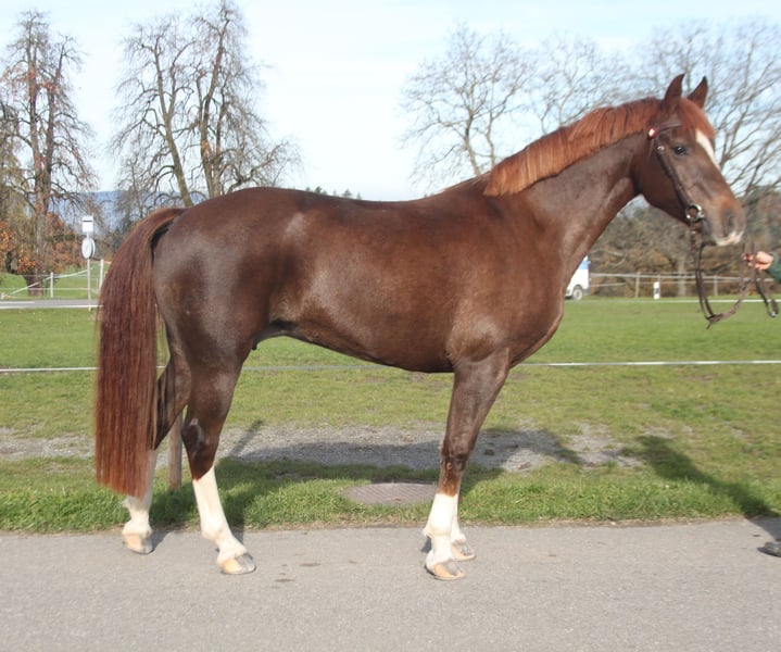 Stute, Fuchs, 155 cm, 11 jährig Bildhübsche Stute, welche top anständig, einfach und lieb im Umgang ist. Sie wird von Kindern, Jugendlichen und Erwachsenen im Gelände geritten. Hier zeigt sie sich sehr unkompliziert, nicht schreckhaft und motiviert. Auch wird sie oft alleine im Gelände ausgeritten. Natürlich ist sie top verkehrssicher, da bei jedem Ausritt auf der Strasse mit Traktoren, LKW, Fahrrad und Töff konfrontiert ist. Die Stute ist auch gefahren. Auch die Arbeit an der Longe sowie auf dem Sandplatz macht sie gerne. Sie kennt Boxen - und Offenstallhaltung, hier zeigt sie sich sehr sozial und ist mit anderen Pferden und Ponys sehr unkompliziert. Die Stute darf gerne besichtigt und ausprobiert werden - für weitere Infos etc gerne per Telefon.