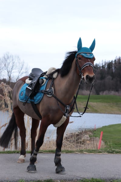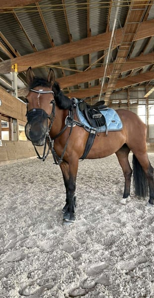 Met pijn in mijn hart neem ik afscheid van mijn 14-jarige Freiberger-Arabier-Trotter-Ponymix, omdat ik wil overstappen naar een groot paard. TinkaFee gaat graag de natuur in, of dat nu alleen of met z'n tweeën is. Tractors en honden zijn voor haar geen probleem. Ze heeft ook wedstrijdervaring. Op wedstrijden is ze heel lief en kijkt ze niet om zich heen. Bij het springen trekt ze sterk naar de sprong toe en heeft ze een duidelijke hand nodig, ofwel om haar vooruit te sturen of om haar terug te nemen. Ze springt alles zonder schrik te tonen. Maar ook vrijheidswerk/grondwerk doet ze met plezier en is ze zeer gemotiveerd om nieuwe dingen te leren. Als uw interesse is gewekt, neem dan gerust telefonisch of het liefst via WhatsApp contact met me op. Accessoires zijn inbegrepen bij de aankoopprijs.