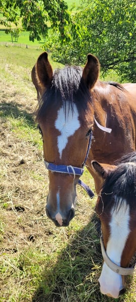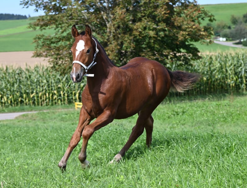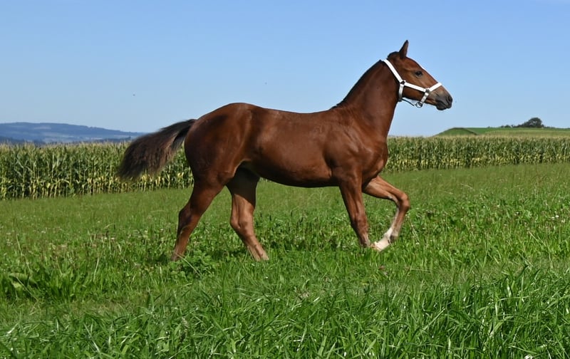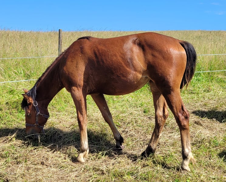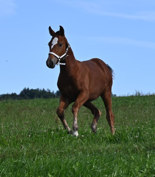 As her 2nd name Howi (lovebird) says, she lives up to her name. She is extremely cuddly, very willing to learn and sociable. As a small foal she was already trained to be loaded, which is now no problem at all. She walks on a halter (rope) and she willingly gives her hooves to the farrier if her coat is stroked nicely. Ayana is growing up in a group together with her mother and two other mares. Sire: Hidao, dam's sire: Neckar. She scored 7 / 6 / 7 at the foal show and I can very well imagine her as a future broodmare. If you are interested, I look forward to hearing from you.