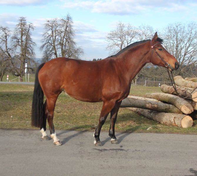 Liebe und brave Freibergerstute, Sie ist top verkehrssicher, unerschrocken und nicht guckig. Im Gelände kann sie von Kindern und Jugendlichen in der Gruppe geritten werden. Auch alleine ausreiten ist für sie kein Problem.Die Stute ist auch sehr viel gefahren. Im Umgang ist sie unkompliziert und tadellos - Kinder können sie führen, putzen, selber Hufe auskratzen sowie auch zum reiten bereit machen. Einfach zum verladen sowie beim Hufschmied. Die Stute hatte letztes Jahr ein dunkles Fohlen - jetzt ist sie tragend von Navarino. Sie ist sich einen lebhaften Landwirtschaftsbetrieb mit grossen Maschinen und Traktoren, spielende Kinder sowie viele verschieden Tiere gewohnt.