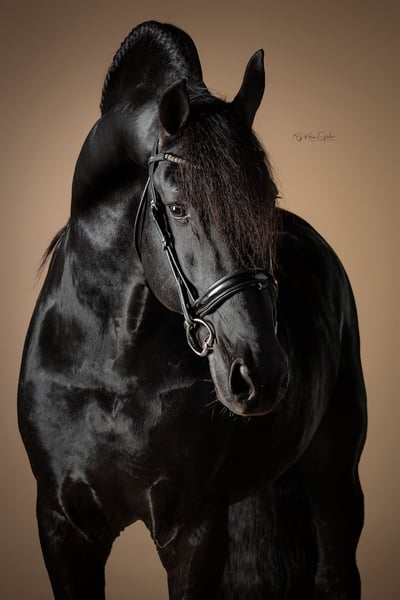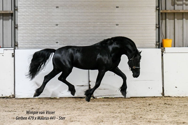 Wimpie is onze koning van stal: statig en indrukwekkend, met een prachtige hals zoals je ze bijna niet meer ziet, makkelijk te hanteren, en een echte werker. Hij is een Sterhengst en heeft afgelopen jaar zijn Sportpredikaat behaald. Wimpie wordt professioneel uitgebracht door zware tour-ruiter Annet Veen en heeft met 2 ruiters het Z-niveau gelopen. Hij beweegt zeer krachtig, heeft een heerlijke galop, maakt mooie (iets nog groene) wissels en toont veel aanleg voor het hogere werk. Zijn vader is Gerben 479 en Wimpie komt uit een topmoederlijn: moeder Fleur van Visser is Ster, Kroon en Sport, grootmoeder Seija van de Olde Mette Moate Ster, Preferent en Sport, en overgrootmoeder Femke Oo. Kroon, Preferent en Prestatie. Wimpie is sinds zijn derde levensjaar bij ons en altijd kerngezond, nooit ziek of kreupel geweest. Hij heeft veel uitstraling, vertoont nauwelijks hengstengedrag, en is volledig ontwormd, ingeënt en klaar voor de volgende stap. Hij heeft sterk beenwerk en is eerder al eens röntgenologisch goedgekeurd, een herkeuring is mogelijk op kosten van de koper. Een unieke kans om een bloedmooie en ervaren Friese hengst met bewezen sporttalent, een fantastisch karakter en een geweldige werkersmentaliteit aan te schaffen! Wimpie valt in de hogere prijsklasse en staat in Appingedam. Meer info & filmpjes: 06-40918538