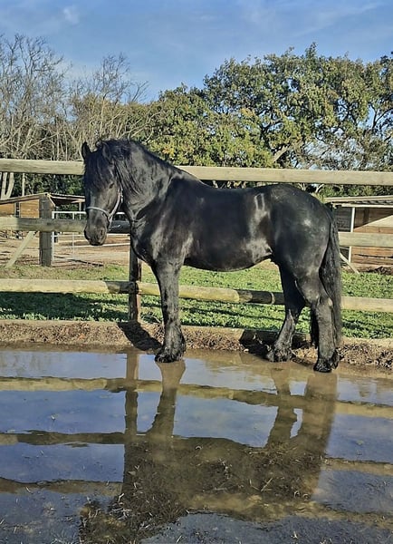 Son of Uldrik 457, a fully Friesen PP gelding in green and yellow (he is from the Netherlands) with an excellent temperament. He is 12 years old (born in 2013), stands approximately 16.1 hh, and is very people-oriented; he loves human contact. Located near Perpignan (66). No health issues, up to date on vaccinations. He is shod on the front feet and trimmed on the hind feet. He has never been used for breeding. He lives surrounded by other horses (although he is kept in an individual paddock), and has sometimes been handled or even ridden previously by my son (a beginner rider with a Galope 1 level). We started working with him from scratch about two years ago. We are progressing steadily. I will take the time to find him his new family; I am not in a hurry. Please contact me via private message for more information.