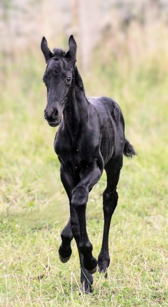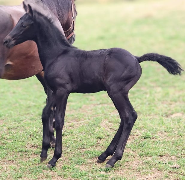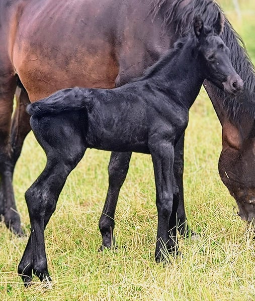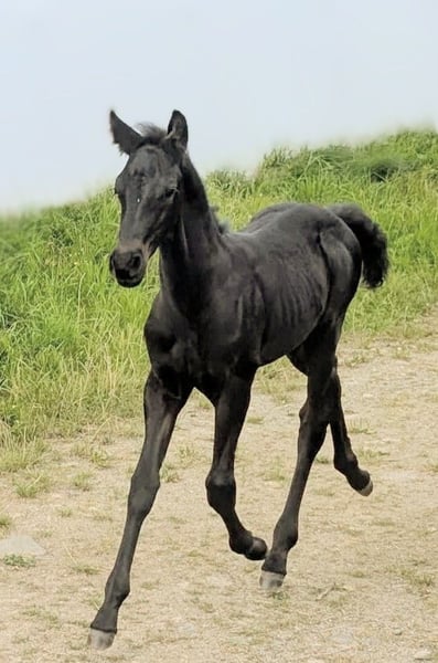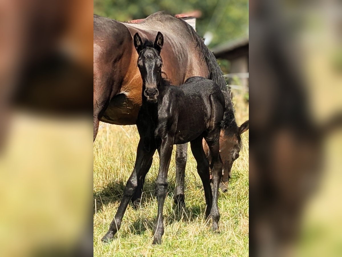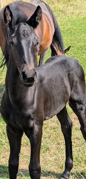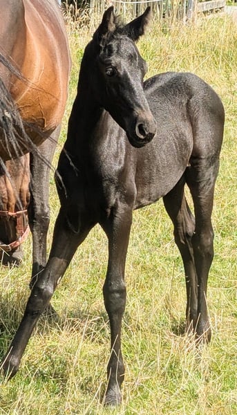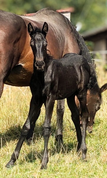Stunningly beautiful shiny bay foal is already looking for his person. He was born on July 12, 2025, and is already about 1 meter tall. A long-legged and very noble young man, who could one day have the world at his feet. He shines like polished and is more of the calm type. He is simply beautifully captivating. His mother is our Trakehner mare with a very noteworthy pedigree. His father is our licensed and ultra-rocky Friesian stallion. He will receive a passport from ZSSE with proof of lineage. We charge €15 for the viewing, which will of course be deducted from the purchase price. If you like this sweet little guy, just get in touch. An appointment for viewing can be arranged soon.
