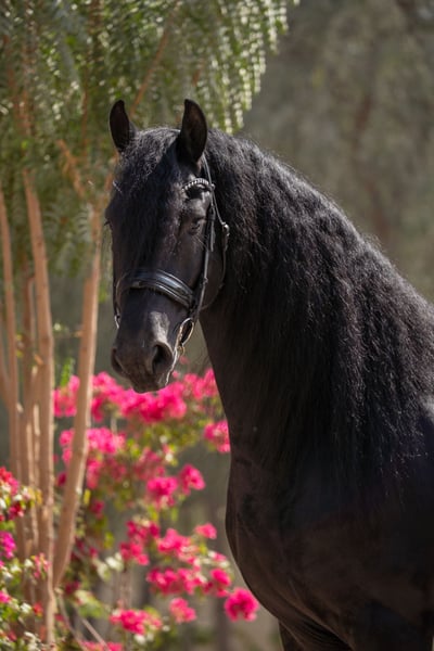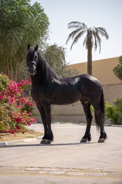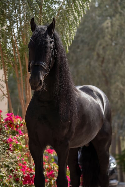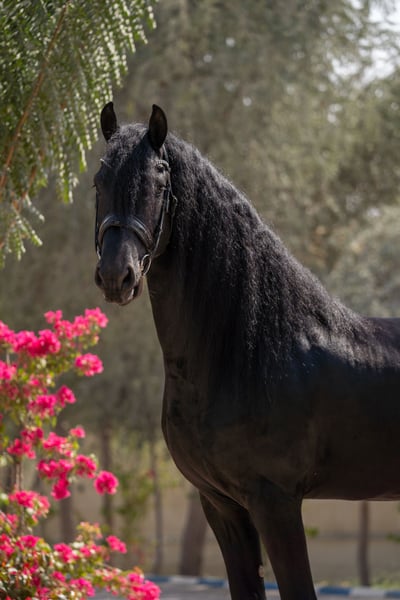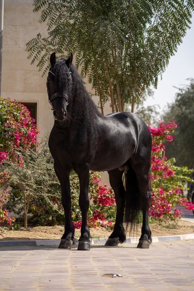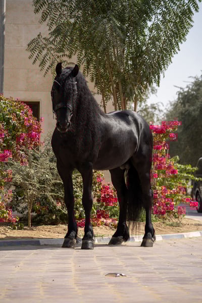 Quatro van ’t Oost 2021 Friesian Stallion Ulbrân x Bente 412 Correctly built young Friesian stallion with a strong topline, good proportions, and a well-set neck. Black coat with abundant mane and tail. Clean legs and correct feet. Quatro is straightforward in handling and has a cooperative, willing attitude. Shows a natural forward way of going and good balance for his age. Suitable as a developing sport prospect or future breeding stallion. Well handled in daily management. Ready to move to a new stable. Available immediately. Located in Dubai, UAE Worldwide Shipping available