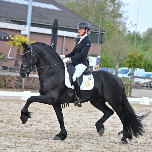 If you are looking for a very gentle, kind, and easy-to-ride sport horse, Oege from Cayenne Stables is truly exceptional. This Ster AAA stallion is among the best young Friesian sport horses of the moment, combining top-quality athleticism with a reliable and friendly temperament. He competes internationally for prizes and holds his own against warmblood dressage horses, demonstrating that he has all the qualities to continue progressing to a high level in dressage. Pedigree: Yme 507 x Beart 411 Breed and sex: Friesian stallion, Ster AAA Year of birth: 2019 Height: 165 cm (16.1 hh) Rider’s height in photo: 180 cm (5’11”) Location: Aalsmeer, Netherlands Studbook: KFPS Netherlands, Ster AAA Sport and Training Current level: Z2 Netherlands, S* Germany, Third Level USA In 2026, Oege will turn 6 years old and will compete in the FEI category for 6-year-olds, combined with participation in Z2 competitions. Training is focused on further refinement, strength development, and confirming his performances at national and international levels. Achievements - Champion of Friesian Dressage Horses - 6th place at the Dutch National Championships - IBOP score just under 90 percent - 4th place at CDI Tolbert Character Oege is exceptionally sweet, gentle, and trustworthy. He is very easy to ride, responsive to aids, and pleasant in daily handling. His work ethic and mental stability make him suitable for both professional riders and ambitious amateurs. In the arena, he demonstrates that he can consistently compete with top warmblood dressage horses. Health Clinically and fully radiologically approved, including legs, back, and neck. About Cayenne Stables At Cayenne Stables, we combine quality with personal attention and care for both horse and rider. We specialize in training, sales, and brokerage of high-quality dressage horses, with horse welfare always our top priority. We are not breeders and do not sell untrained horses or horses that have not yet reached an age-appropriate level of physical and mental development. Our horses are professionally guided over the long term by a dedicated team of trainers, veterinarians, farriers, and physiotherapists. Our advertisements aim to showcase our horses and our vision, not out of haste or necessity to sell, but based on trust in the right match at the right time. Contact: 📞 Mobile (call/WhatsApp): +31 6 81131407 | 📧 Email: info@cayennestables.nl 🌍 www.cayennestables.nl | 📸 instagram.com/cayennestables | 🌐 facebook.com/cayennestablesbv (EN) | 🇳🇱 facebook.com/cayennestables (NL)
