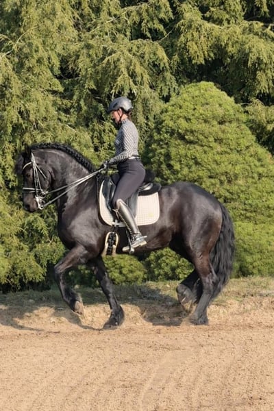 Zum Verkauf steht unser wunderschöner Friesenhengst Gouke fan Wettersicht, 8 Jahre alt, der durch seine Ausstrahlung, sein Talent und seinen einzigartigen Charakter begeistert. Gouke ist ein unheimlich charismatischer Hengst mit viel Ausdruck, einem tollen Bewegungsablauf und großer Präsenz. Trotz seines Hengstseins ist er beim Reiten absolut unkompliziert und zeigt sich jederzeit brav, motiviert und zuverlässig – null hengstig unter dem Sattel. Er ist bereits weit gefördert und sicher auf M-Niveau ausgebildet. Lektionen der Klasse M werden zuverlässig gezeigt. Die fliegenden Wechsel sind angelegt, jedoch noch nicht zu 100 % gefestigt. Darüber hinaus beherrscht Gouke bereits Piaffe, Passage sowie Spanischen Schritt, die er mit viel Ausdruck und Freude an der Arbeit präsentiert. Durch sein Talent, seine Rittigkeit und seine besondere Ausstrahlung eignet er sich sowohl für ambitionierte Dressurreiter auch für Liebhaber der Friesenrasse, die ein besonderes Pferd suchen. Gouke überzeugt nicht nur unter dem Sattel, sondern auch im täglichen Umgang durch sein freundliches und angenehmes Wesen. Bei ernsthaftem Interesse freuen wir uns über Ihre Nachricht und geben gerne weitere Informationen. Name: Gouke fan Wettersicht Rasse: Friese Alter: 8 Jahre Geschlecht: Hengst Ausbildungsstand: M-Dressur (Piaffe, Passage, Spanischer Schritt)