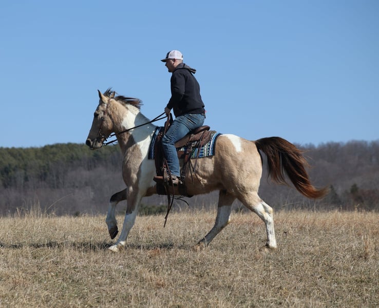 "AVAILABLE ON ONLINE HORSE AUCTION AT www DOT PlatinumEquineAuction DOT com BIDDING OPEN NOW thru SUNDAY | MARCH 15TH! *Final price will be determined on auction site* CONSIGNOR CONTACT INFO: Korey Patrick 606-310-2428 LOCATION: Brodhead, KY If you want color, class, experience and a nice ride... James is your guy! James is a super cool, buckskin tobiano, Friesian Cross gelding that is standing around 15.3hh and he is very well built. He is 10 years old and he has all the good looks, and with miles of experience to go along with it! James has been trail ridden throughout Kentucky, Tennessee and Virginia and he knows all about traveling and trails. He will cross creeks, ditches, logs and navigate rough rocky areas. He moves around real nice and is content to plod along down the trails as well! He has been exposed to all kinds of wildlife such as deer or turkey and will go anywhere that he is asked too. He will go up or down even the steepest slopes, across deep creeks, over downed trees, and over all types of rough terrain while still being sure footed. James has been ridden down the highways and is traffic safe. He is not cinchy, cold backed, does not crib or weave. If you want flashy, substance and safe... James is a great choice! Feel free to call Korey Patrick 606-310-2428 with any questions. Located in Brodhead, KY
