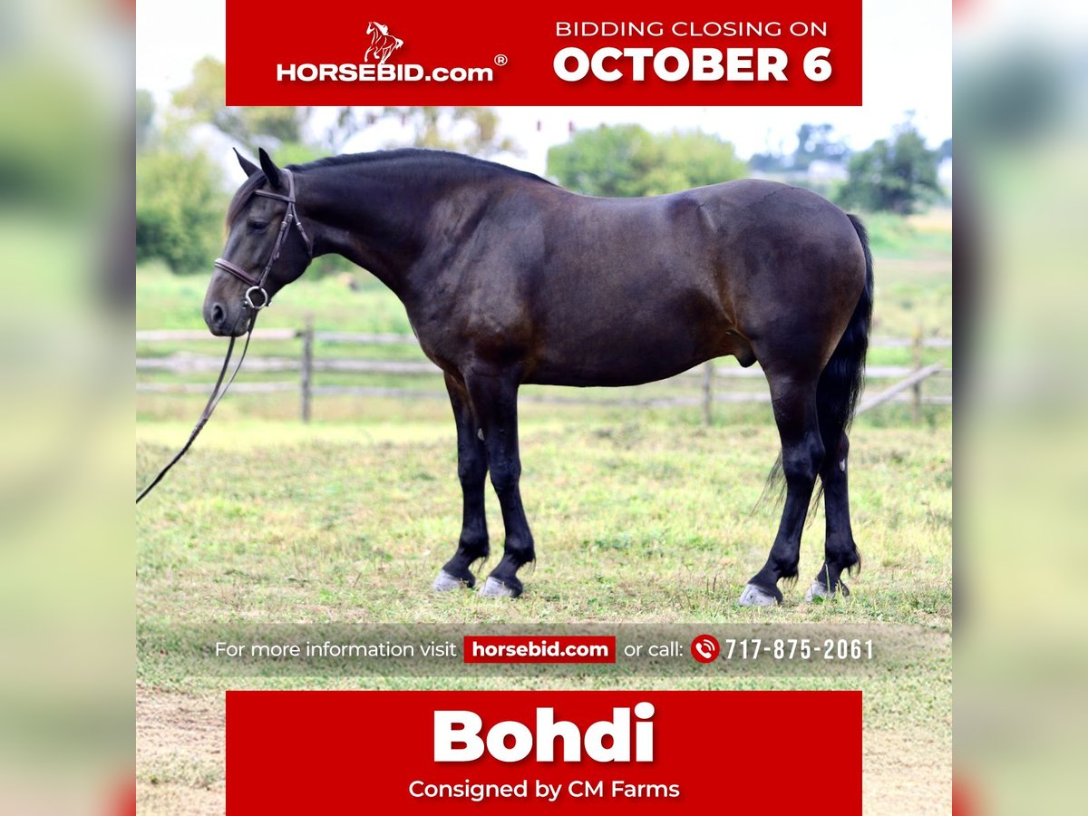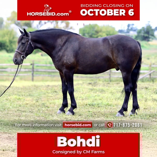 🍂 𝓐𝓾𝓽𝓾𝓶𝓷 𝑨𝑳𝑳 𝑺𝑻𝑨𝑹 𝑳𝑰𝑵𝑬𝑼𝑷 🍂 Happening now thru MONDAY | OCTOBER 6th - Available EXCLUSIVELY on HorseBid's website! For more details and to register visit: www.Horsebid.com CONSIGNOR CONTACT: CM Farms 717-875-2061 LOCATION: Gap, PA BREED: Morgan/Friesian X REGISTERED: No COLOR: Bay/Black HEIGHT: 16–16.1hh AGE: 9 GENDER: Gelding ✨Meet Bohdi✨ This stunning hunk of a gelding is a 9-year-old, 16–16.1hh Morgan/Friesian cross. He’s broke to ride both Western and English, or hop on bareback! Bohdi has lovely conformation and takes up leg well. Riding him feels like sitting on a couch. With a sweet personality and a love for people, he’s quickly become a barn favorite. He loves to trail ride, and he’ll be one of the best trail partners you’ll ever find. Seriously—this guy has ridden everywhere: through the drive-thru for lunch, down the strip in town, to the grocery store, Wawa, all the mountain trails—you name it! He truly loves to go out and is a steady, reliable partner every time. Steep banks or water crossings don’t bother him—he’s been there, done that. Bohdi will happily go for a dip in the river, cross covered bridges, climb steep mountains, and travel through open fields, all while staying relaxed around hikers, bikers, and dogs. Logs and small fences? He’ll pop right over. He’s schooled cross-country and proved himself to be fairly athletic! With more conditioning, he could easily clear some large jumps. (He could stand to lose a few pounds😂.) That being said, Bohdi is an extremely easy keeper and will keep your feed bill low! He’d be a great choice for a guest/husband horse, fox hunting, paper chases, or simply logging miles on the trail. We’d throw just about anyone on him for a trail ride- and not have to worry. In the arena, Bohdi walks, trots, and canters both directions with correct leads. Most of his focus has been on fitness and muscle building. He’s well educated, knows collection, has a handy neck rein, moves off the leg, and is knocking the rust off his spin and side pass. With consistent work, he improves every day and is developing a wonderful willingness to work. He’s the perfect balance of whoa and go—forward when asked and stopping on a dime. Comfortable to sit, with an easy trot, this gelding would look fancy in a dressage ring. He’s been schooling simple jump combinations and has done amazingly well. He’s always a straightforward and simple ride. Bohdi prefers trail riding over arena work, but he’ll put in the effort when asked. Intelligent and curious, he likes to stay interested and engaged. Reliable enough to pack around the “drunkles” and a perfect gentleman for lead-line rides with the littles. In the ring, Bohdi is a fun and talented enough horse for experienced riders, though sensible enough he could also be suitable for an amateur working with a trainer. In the barn, Bohdi is always a good boy. Kids can braid him, tack him up, or run around without issue. Safe to have around, he has excellent ground manners, loves attention and treats, and will stand for hours on the ties for a spa day. He’s easy to turn in and out, gets along with all the other horses, loads right up, and is well-behaved in his stall. Always respectful for the vet, dentist, and farrier, Bohdi is a kind, dependable horse with a bright future. Bohdi is UTD on shots, dentist, coggins, farrier, and deworming.