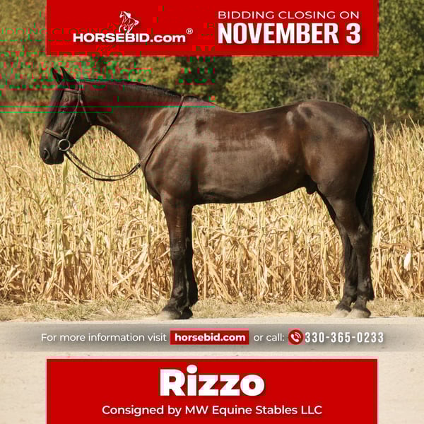 ⚜️𝐓𝐇𝐄 𝐅𝐀𝐋𝐋 𝐇𝐄𝐑𝐈𝐓𝐀𝐆𝐄 𝐂𝐋𝐀𝐒𝐒𝐈𝐂⚜️ Happening now thru MONDAY | NOVEMBER 3rd - Available EXCLUSIVELY on HorseBid's website! For more details and to register visit: www.Horsebid.com CONSIGNOR CONTACT: MW Equine Stables LLC 330-365-0233 LOCATION: Fresno, OH BREED: Friesian Sporthorse (Friesian/Percheron/Morgan) REGISTERED: Yes REGISTERED NAME: Rizzo COLOR: Black HEIGHT: 16.3 AGE: 10 GENDER: Gelding Rizzo Is a total dream horse that will get heads turning no matter where you take him. He is a 16.3 2015 Friesian Sporthorse (Friesian/Percheron/Morgan) gelding. He rides English and Western.. Rizz rides great on the trails as well as the arena.. We ride great by himself as well as with a group.. Rizzo has no funny business and enjoys having a job and is extremely willing. He has a solid W/T/C both directions. He has a ground covering stride and pretty movement. strives to please and has work ethic. He is schooling First/Second level. Scoring First level tests in the 70’s. Jumping 3ft courses with changes, with plenty of scope. He has no buck rear or kick. He loves to trail ride and crosses all obstacles. He had been Fox hunted frequently and hunted first and second with no issues. On the trail, Rizz will happily go in the front or back of the pack. This brave boy is the first one into the water, be it crossing the stream, or going for a swim in the lake. He’s good in a group with horses riding up close behind him and doesn’t get upset. In the barn, Rizz has no bad stall habits He picks up all four feet and is good for the farrier. He stands to groom, clipped and saddled. He never causes problems in the pasture and gets along with everyone. He is a gentleman no matter the situation I trust him to take care of any level rider. Has been lightly used in lesson program and is my guest/friend/family horse for any trail or outing with inexperienced riders. Located in Fresno Ohio, Call or text 330-365-0233