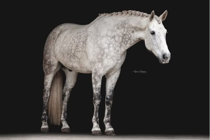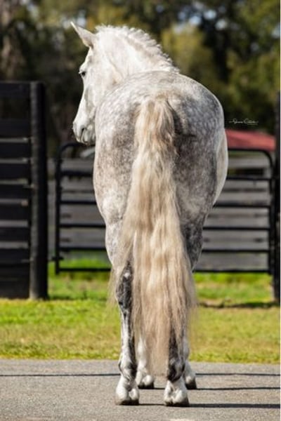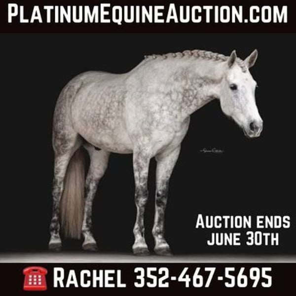 ONLINE AUCTION PLACE YOUR BIDS AT PLATINUMEQUINEAUCTION DOT COM $3500 STARTING BID AUCTION ENDS JUNE 30TH Aladdin is a gorgeous grey 9yr Friesian x Andalusian gelding standing 16.1h. Aladdin trains in dressage and has been to several big shows including the World Equestrian Center. He has shown at training level and also schools leg yielding, shoulder-in, travers, reinback, turn on the haunches, simple changes, and collections and extensions within the gaits. Aladdin is a brave and curious horse, always well-mannered in new places. He cross trains in jumping, cross country, trail riding, and trail obstacle. He would be a great prospect for working equitation or eventing. Aladdin is a sweet boy with a big playful personality. Always a doll for grooming, bathing, tacking, clipping, etc. He is up-to-date on shots, Coggins, floating, deworming, sheath cleaning, and hoof trimming. If you have any questions about this beautiful dappled grey Friesian x gelding, please call Show Me Sport Horses Rachel 352-467-5695. Aladdin is located in Ocala, Florida and shipping can be arranged anywhere in the country.