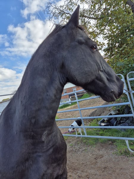 Hallo leider muss ich mich schweren Herzens aus persönlichen Gründen von meinem tollen Friesen mix Wallach trennen. Er ist ca 170cm groß und 11 Jahre alt. Er wurde von mir schonend am Boden und im Sattel ausgebildet. Am Boden liebt er zirzensik. Ich bin als er noch jung war viel mit ihm spazieren gewesen und habe viel bodenarbeit gemacht unter anderen, zirzensik, longieren, Freispringen( nicht seine lieblings Disziplin), equikinetik, Schrecktraining, kleine Trails und hängertraining. Auch war ich schon bei auswärtstraining mit ihm. Seitdem weiß er leider wenn man ihn wegfahren möchte, dann steigt er sehr ungern in den hänger. Beim verladetraining ist das einladen kein Problem. Unter dem Sattel bin ich ihn nur Schritt und Trapp auf dem Platz geritten da kann er aber auch schon vieles. Zb. Konterschulterhein, Schulterherein und Travers. In der Herde ist er sehr rangniedrig sodass er viel von den anderen herumgeschickt wird. Deswegen steht er bei mir in einer sehr großzügigen Paddockbox mit Weidegang. Dies wünsche ich mir für ihn auch weiterhin, dass er nicht in einen Offenstall muss wo er nur weggeschickt wird. Er ist ein kleiner quatschkopf und für alles zu haben, wenn er in seiner komfortzone bleiben darf. Versucht man ihn aus dieser herauszuholen wird er ängstlich und weiß sich durchzusetzen oder auch mal davon zu rennen. Deswegen nur an erfahrene, durchsetzungsfähige pferdeleute zu verkaufen. Hat man ihn auf seiner Seite und befindet man sich in einer komfortzone so ist er das liebste Pferd. Leider komme ich auf grund von zeitmangel nicht dazu ihn weiter auszubilden und deswegen steht er schon sehr lange. Ein probereiten ist nach Absprache möglich, da kann auch das verlassen der komfortzone genauer gezeigt werden. Für ein probereiten werden 40 Euro verlangt die beim Kauf verrechnet werden. Er war immer gesund und hat einen sehr starken Körperbau. Er läuft barhuf hat sehr feste Hufe und ist regelmäßig beim hufschmied Er ist regelmäßig Tetanus geimpft und auch entwurmt worden. Kommt aus den Niederlanden und hat keinen abstammungsnachweis. Bei weiteren Fragen gerne melden.