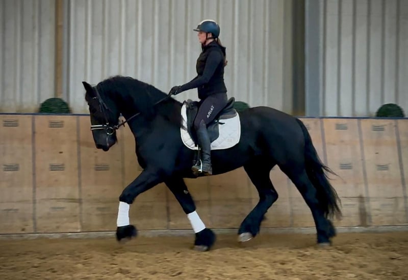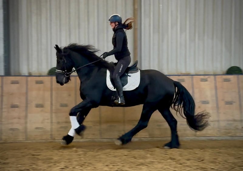 Name: Pol v.d. Strohoeve Breed: Friesian Gender: Gelding Date of Birth: April 10, 2013 Age: 10 years Height: 16.1 hh Color: Black Pedigree: with pedigree certificate Temperament: personable, reliable, patient, curious, intelligent, brave Training/ suitability: leisure riding, dressage, baroque riding Trail Experience: attentive, dependable, fearless, comfortable alone or in a group Health: dewormed, vaccinated, barefoot, eczema-free, teeth checked, osteopathically treated Stabling: box stall, open stable Special Features: farrier and loading safe, herd-friendly The listed qualities are based on our personal assessment and do not constitute a guarantee of traits. Price: €8,500 (gross price) Have we sparked your interest? To give you a better impression of Pol, we are happy to send you a video of him riding. Of course, we are available for a detailed description of the horse, personal consultation, and to answer all your questions via phone. Please feel free to contact us anytime via WhatsApp message or call us at: +49 151 19487595 Our phone hours are daily from 7:00 AM to 1:30 PM and again from 8:00 PM. We look forward to hearing from you! A clinical or radiological purchase examination can be performed by your veterinarian of choice. Pol can be safely and comfortably delivered to his new home. We handle all necessary preparations and transport to ensure your new horse arrives stress-free, well cared for, insured, and in good health. Currently, we offer a carefully selected variety of horses for sale. With us, you are sure to find your dream horse. Feel free to visit our website at www.marvinsroyalhorses.de. Dear customers, we are happy to introduce you to our horses and offer grooming, tacking, lunging, ground work, as well as trial riding in the riding hall, on the arena, or in the field to help you get to know your new family member. The fee is €40 per horse, with each additional horse €30, and will be refunded upon purchase. Our address: Ferdinand Grube 50 53577 Neustadt-Wied Google Maps: marvinsroyalhorses