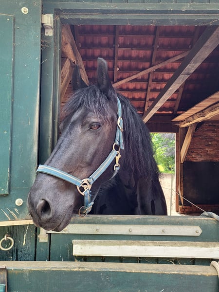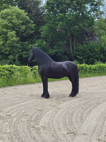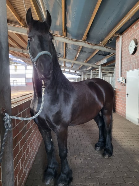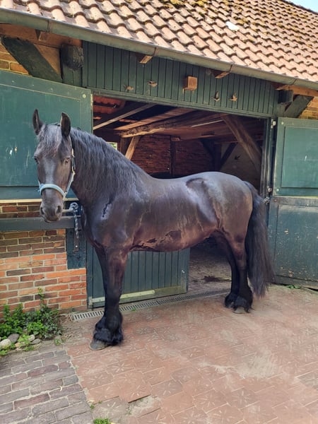 Here I am offering my Friesian gelding, who is an absolute sweetheart to handle. He has only been ridden for leisure purposes and has no experience in competitions. He enjoys groundwork and can perform a few circus tricks. He is very kid-friendly and calmly tolerates being lunged and ridden by children. I have owned him since he was just under two years old, and he has been healthy throughout this time. I am looking for a new home for him, as personal and health-related changes mean I cannot give him the attention he deserves anymore. He truly is a loyal and friendly companion!