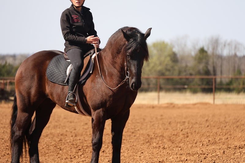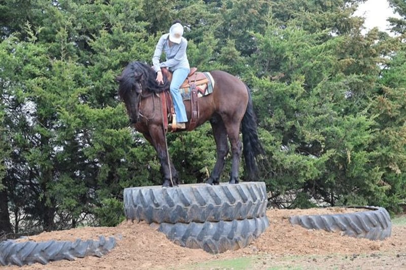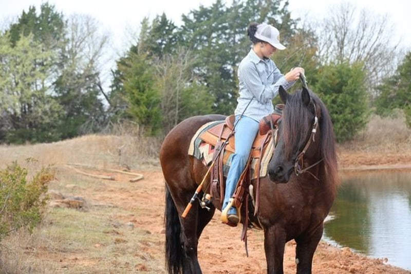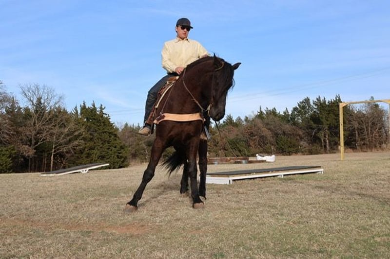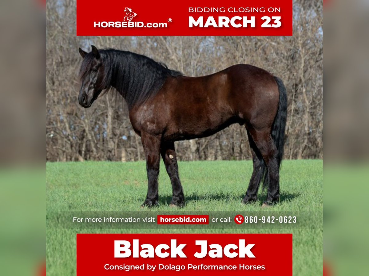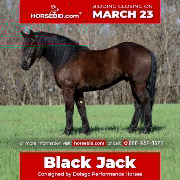 ⚜️𝓽𝓱𝓮 𝐆𝐎𝐋𝐃 𝓢𝓮𝓵𝓮𝓬𝓽⚜️ Happening now thru MONDAY | MARCH 23rd - Available EXCLUSIVELY on HorseBid's website! For more details and to register visit: www.Horsebid.com CONSIGNOR CONTACT: Dolago Performance Horses 860-942-0623 LOCATION: Ripley, OK BREED: Friesian Cross REGISTERED: No COLOR: Black HEIGHT: 15 AGE: 5 GENDER: Gelding If you’re looking for a horse that will absolutely stop people in their tracks, Black jack is the one. He has the kind of presence that’s hard to find… big, elegant, and eye catching everywhere he goes. With his great confirmation , kind eye, and striking look, he truly stands out in a crowd. He stands 15 hands tall weighing 1200 lbs. He’s thickly built with a mane and tail just as thick… talk about hair goals! This is the type of horse that people notice immediately when you step off the trailer. Not only does he have the looks to impress, but he also has the personality to match. He is extremely friendly and loves attention, always the first to meet you at the gate and happy to be around people. He’s a very easy keeper in a stall, pasture, or run. Under saddle he is incredibly smooth and comfortable to ride. He is soft, willing, and has a great mind, making him very easy to get along with no matter the rider. He has a nice stop, turn around, and he rides in your hand. Whether you’re riding in the arena or out exploring, he stays relaxed and confident. He’s the type of horse that gives his rider a lot of confidence because he handles new situations with a calm attitude and a willing mindset. He’s been trail rode countless miles, through town, water, ditches, and anything thats in front of him. He’s been rode english and is just a great english horse with a great jump! He’s also been used as a ranch horse many times tagging calves, sorting at the feed lot, and opens and shuts gates. He’s been in a few parades and wedding pictures and never batted an eye. One of his best qualities is his willingness and bravery. Point him somewhere and he will go without hesitation. He will ride through or into just about anything you ask him to, showing a great deal of trust. Horses like this are hard to find because they combine great looks, a kind personality, and a willing attitude all in one package. This Friesian cross gelding is the kind you can enjoy every day and be proud to own wherever you take him.