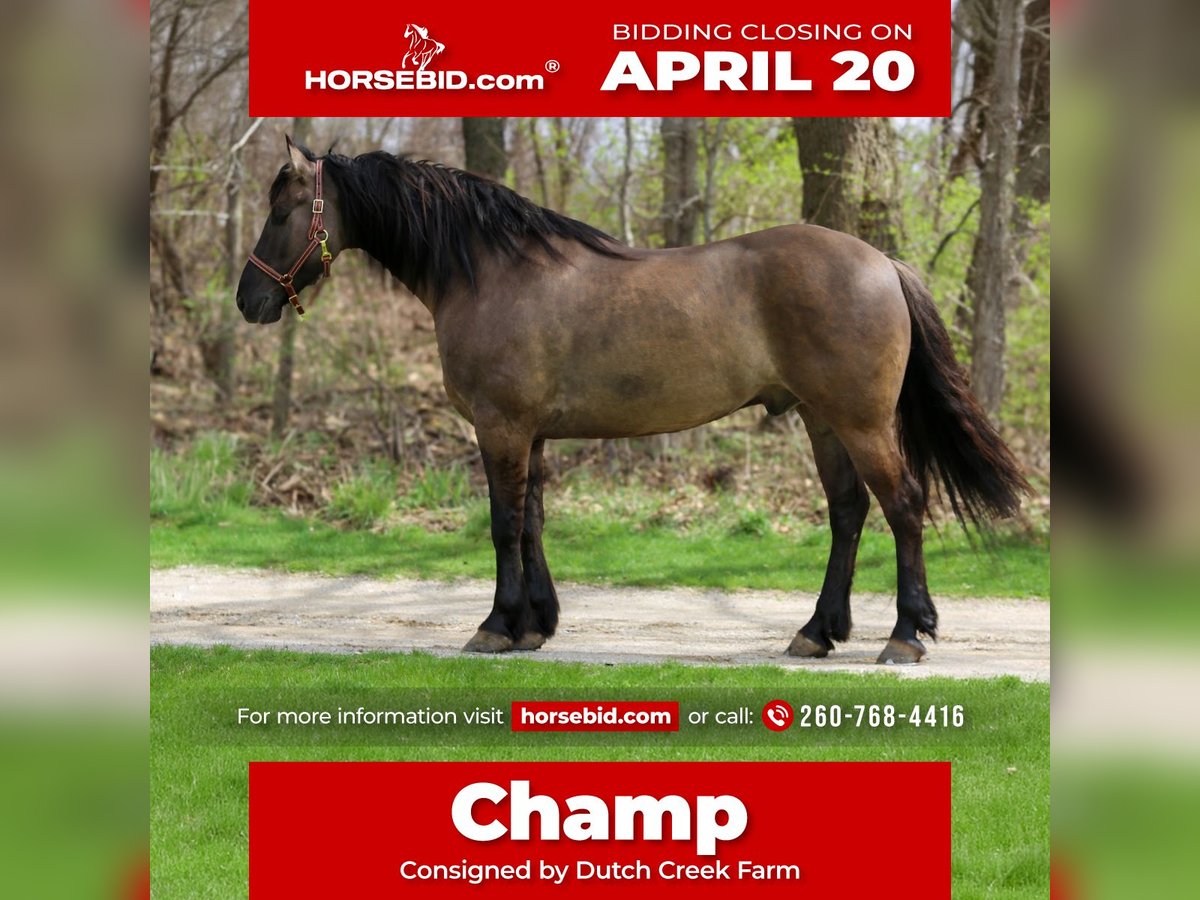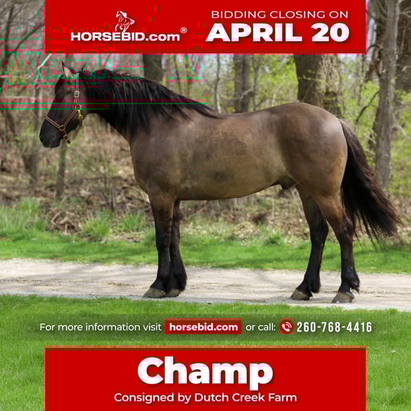 ⚜️𝐭𝐡𝐞 𝓔𝓵𝓲𝓽𝓮 𝐒𝐩𝐫𝐢𝐧𝐠 𝐂𝐥𝐚𝐬𝐬𝐢𝐜⚜️ Happening now thru MONDAY | APRIL 20th - Available EXCLUSIVELY on HorseBid's website! For more details and to register visit: www.Horsebid.com CONSIGNOR CONTACT: Dutch Creek Farm 260-768-4416 LOCATION: Shipshewana, IN BREED: Friesian/Quarter Horse Cross REGISTERED: Yes REGISTERED NAME: Champ COLOR: Grullo HEIGHT: 15.2 AGE: 5 GENDER: Gelding Champ is a 5 year old 15.2 hand friesian/quarter horse gelding. FBHR registered. With his gorgeous grullo color he sure is a handsome guy. Trained to ride and drive. Champ has seen lots of trails. He will cross logs, through water, brush or any other obstacle you may meet on the trail. Champ also rides great in the arena. We have also rode him in English tack and have taken hi over jumps and he does great. He rides bareback as well. He has also been driven all over the farm or been used to go on a Sunday cruise. Champ was born and raised on our farm. If you feel this is the one for you be sure to check him out or call 260-768-4416.