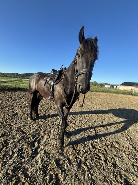 For sale is a beautiful Friesian gelding, born in 2021. With his elegant appearance as a black horse and a height of 16.1 hands, he is truly a sight to behold. This talented gelding is well-suited for dressage and already shows promising potential in his training. His friendly nature and eagerness to learn make him an ideal partner for ambitious riders who enjoy working in dressage. He is well-mannered, easy to handle, and has a pleasant temperament. Whether for leisure riding or competition, this Friesian will impress you with his elegance and charm. He is neither spooky nor has any vices under saddle or during work. Farrier visits, grooming, and loading onto a trailer are no problem for him. He is very sociable and low-ranking in the herd and is currently kept in a group during the day and in a stall at night. Location: 8410 Wildon If you are interested or would like more information and videos, please feel free to contact us. We look forward to hearing from you!
