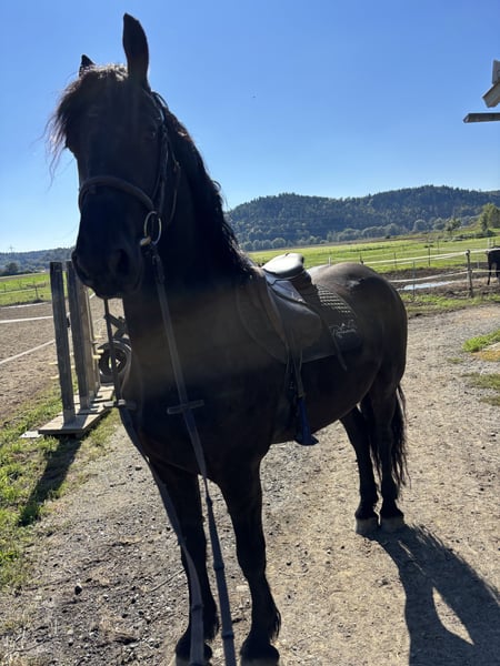 Zum Verkauf steht ein wunderschöner Friesen-Wallach, geboren im Jahr 2021. Mit seinem eleganten Erscheinungsbild als Rappe und einem Stockmaß von 160 cm ist er ein echter Blickfang. Dieser talentierte Wallach ist bestens für die Dressur geeignet und zeigt bereits vielversprechende Ansätze in der Arbeit. Sein freundliches Wesen und seine Lernbereitschaft machen ihn zu einem idealen Partner für ambitionierte Reiter, die Freude an der Dressurarbeit haben. Er ist gut erzogen, brav im Umgang und hat ein angenehmes Temperament. Ob für den Freizeit- oder Turniereinsatz – dieser Friese wird Sie mit seiner Eleganz und seinem Charme begeistern. Er ist weder schreckhaft noch hat er Unarten beim reiten bzw bei der Arbeit. Hufschmied, einsprühen sowie Hänger sind kein Problem für ihn. Er ist sehr verträglich und rangniedrig und wird momentan tagsüber in der Herde und nachts in der Box gehalten. Standort: 8410 Wildon Bei Interesse oder für weitere Informationen sowie Videos melden Sie sich gerne. Wir freuen uns auf Ihre Nachricht!
