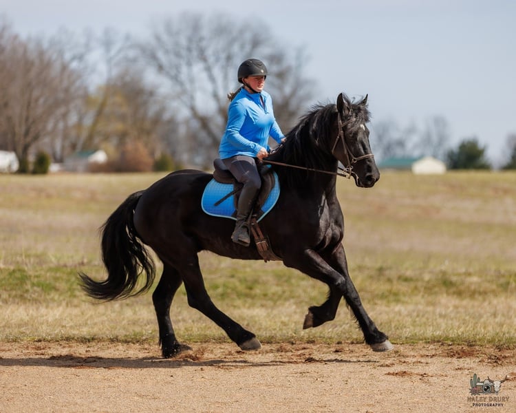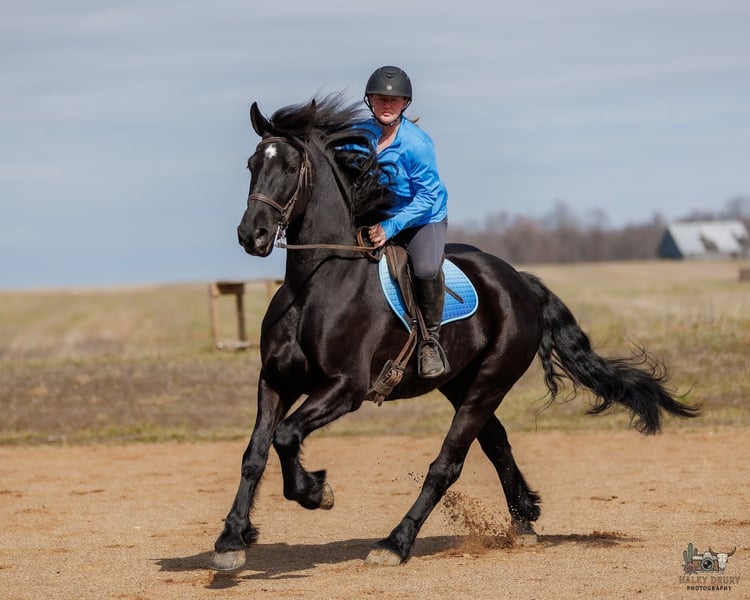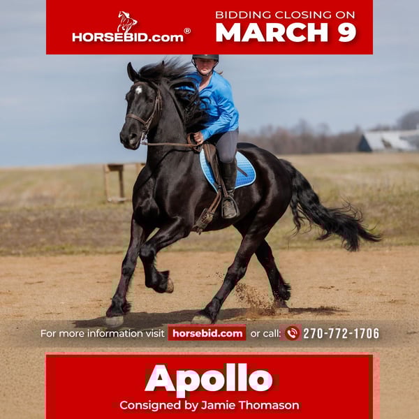 ℳ𝒶𝓇𝒸𝒽 ♦️𝐑𝐈𝐃𝐄𝐑'𝐒 𝐂𝐇𝐎𝐈𝐂𝐄♦️ Happening now thru MONDAY | MARCH 9th - Available EXCLUSIVELY on HorseBid's website! For more details and to register visit: www.Horsebid.com CONSIGNOR CONTACT: Jamie Thomason 270-772-1706 LOCATION: Auburn, KY BREED: Friesian Cross REGISTERED: No COLOR: Black HEIGHT: 16 AGE: 5 GENDER: Gelding Brave, bold, and undeniably beautiful, Apollo is the kind of horse that turns heads wherever he goes. Whether you prefer the arena or the trail, English or western, he steps up with confidence and style. At five years old, this striking 16-hand black gelding is a unique blend of Friesian, Percheron, and Quarter Horse. He combines athletic ability with eye-catching presence and a willing mind, making him a strong candidate for a promising future in a variety of disciplines. A beautiful mover in the ring. Apollo is the perfect combination of whoa & go. He has an airy trot & an amazing canter. Has nice up & downward transitions. Can enter a canter from a near standstill. Travels in the correct lead. Soft in the bridle. He will pick himself up, collect, and ride with contact, but just as easily travels on a loose rein. Moves laterally & works well off your feet and seat. Apollo is willing and brave over 2-2’3 fences. Plenty of scope to take a rider to higher levels. He enjoys a challenge. Apollo has traveled off property to various arenas & out on the trail. Drives single, down the road, to church, & to town. Easy to load & haul. He hacks out alone or in a group, is not herd bound. Confidently crosses water, natural obstacles, sure-footedly navigates uneven terrain, goes up and down inclines, across bridges, & is traffic safe. Apollo is a pleasure to own & have at home. Impeccable ground manors. Ground ties for grooming, to harness, and to saddle. He enjoys countless minutes of grooming from the kids. Always calm, patient, & tolerant of the chaos that comes with children. He’s been lead in and out of the stall by my son more times than I can count while doing my barn chores. Always easy to catch, does well in a stall, or perfectly content living outside in a mixed herd. Apollo will “pick you up” at the mounting block, stand patiently until you ask him to walk on, and side pass over to wherever you decide to get off. He also, offers the same manors while mounting & dismounting from the ground. Whether you’re searching for a classical or western dressage candidate, a promising working equitation prospect, a willing jumping partner, or a dependable trail companion, Apollo is a standout choice. With his solid foundation, trainable mind, and natural ability, he’s ready to continue developing in any direction you choose. He offers the versatility, presence, and heart to be a rewarding partner for years to come! If you would like to meet Apollo prior to adding him to your family or have any additional questions, feel free to reach out! We can assist in arranging shipping to anywhere and PPE’s are always welcome!