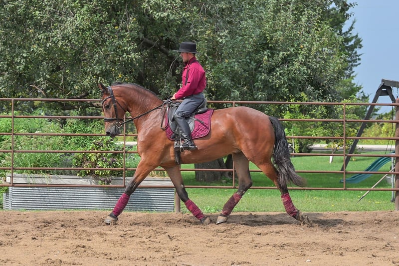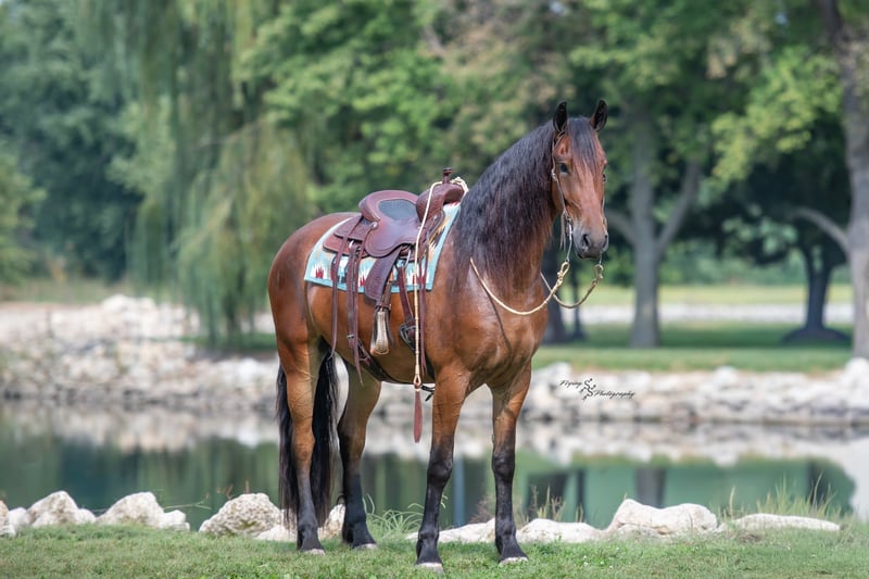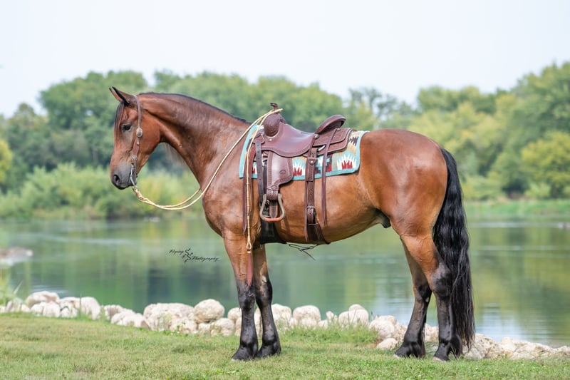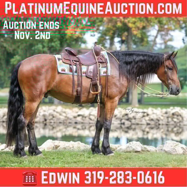 ONLINE AUCTION Place your bids at www.PlatinumEquineAuction.com Starting Bid $3500 Auction ends November 2nd, 2025 Need a new saddle? Check out White Rock Saddles on our website or Facebook One look at Donald is all it takes to confirm every reason why Friesians have been known as royal horses. He is the definition of elegance with the power to perform. Donald is a 4 year old FBHR registered Friesian cross gelding who stands 16.2h, wears a size 3 shoe, and weighs in at approximately 1,400 lbs. He is an outstanding show prospect who has all of the potential in the world to excel in English events. Donald has been exposed to the sights on trails, obstacles in the arena, and even the hustle and bustle of small town life. He is thoroughly desensitized, and is ready to go on in his training. Donald has been started in dressage and already shows so much natural talent. He is such a beautiful mover that even people, who are inexperienced with horses, can see the raw ability that he has. Donald has been ridden extensively in both English and Western tack, and has an excellent foundation in his training in both disciplines. We believe that this makes him so much more well-rounded and versatile for his next riding partner. Donald is a very forward mover, with an impressive extended trot. We feel that he would be best suited for someone who is intermediate to advanced in their showing and riding ability, or someone who is paired with a trainer. Donald could easily be paired with a beginner adult rider, with the aid of a trainer. Donald is sired by Zebb M a purebred Friesian Stallion, and is out of a sporthorse mare who was 50% Friesian, thus making this stunning gelding 75% Friesian. Whether you have a preference for English or Western discipline, we believe that Donald will excel in Dressage or Western Dressage. If kept in training, he could also be very competitive in jumping, eventing, or equitation. Donald handles traffic well, and is not bothered in the least by all of the distractions you typically see when driving through a small town. He crosses water without hesitation, gracefully walks over logs in a trail pattern or over downed timber out on the trail. He has been ridden around large and small livestock as well as poultry, and has also been exposed to wildlife in fields and on trails. When doing arena work, Donald has been ridden in indoor and outdoor arenas, handling both with confidence. He has very impressive agility, and is capable of adapting to different types of footing with ease. You can expect the same ride every time you mount up, as Donald is consistent in his performance even with extended time off. He is honest, you will have no need to worry about hump or buck, even when he is fresh. Donald is well mannered and does wonderful whether he is turned out in the paddock or kept stalled. When turned out, he gets along well with pasture mates and is easy to catch. Donald stands tied, cross ties, is a gentleman for the farrier and veterinarian, clips easily, and stands perfectly to be braided. He stands quietly to be tacked up, for polo wraps, and also stands for the mounting block. I am happy to speak with you or your trainer to ensure that Donald is the perfect fit for you. He will come with a current negative coggins and a Pre-purchase exam from my veterinarian. If you are interested in meeting Donald or have any questions prior to the auction ending, please call Edwin Raber at 319-283-0616. Located in Fairbank, IA. ONLINE AUCTION Place your bids at www.PlatinumEquineAuction.com Starting Bid $3500 Auction ends November 2nd, 2025 Need a new saddle? Check out White Rock Saddles on our website or Facebook