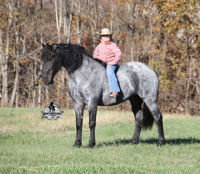 𝐀𝐝𝐚𝐦'𝐬 𝐇𝐨𝐫𝐬𝐞 & 𝐌𝐮𝐥𝐞 𝐂𝐨𝐦𝐩𝐚𝐧𝐲'𝐬 ✷𝑬𝒗𝒆𝒓𝒚 𝑴𝒊𝒍𝒆 𝑨 𝑴𝒆𝒎𝒐𝒓𝒚✷ 𝐄𝐗𝐂𝐋𝐔𝐒𝐈𝐕𝐄 𝐒𝐀𝐋𝐄 Happening now thru MONDAY | FEBRUARY 2nd - Available EXCLUSIVELY on HorseBid's website! For more details and to register visit: www.Horsebid.com CONSIGNOR CONTACT: Adams Horse and Mule Company 606-308-2461 LOCATION: Mt. Vernon, KY BREED: Friesian Heritage Horse REGISTERED: Yes REGISTERED NAME: RRS Trumpin Travis COLOR: Blue Roan HEIGHT: 16.1 AGE: 6 GENDER: Gelding Sweet dreams are made of this!!! RRS Trumpin Travis is the big, stout, true blue roan registered Friesian Heritage Horse Gelding!!! He is a 16.1h+ and is a 2019 model. Travis he is a very smooth mover as he, takes the correct leads, lopes nice circles, reins around and stops with ease! Travis is safe for any level or any age of rider!! He has been ridden by our kids with no issues. Travis has been ridden inside and out. He is good in the arena, he has been ridden down the highways and he is traffic safe. Travis is great on trails and he will cross creeks, ditches, logs and navigate rough rocky areas. He has been exposed to all kinds of wildlife such as deer or turkey and will go anywhere that he is asked too. He has been ridden many miles in the mountains of Eastern Kentucky and encountered every obstacle possible on the trail. He has been on several week-long camping trips. He hauls well and picketline ties also. He will go up or down even the steepest slopes, across deep creeks, over downed trees, and over all types of rough terrain while still being sure footed. Travis has no bad habits! In addition to riding, Travis has been drove single, double and in a 4 horse hitch pulling an old west stage coach! He has been worked in all types of farm machinery, has been drove through town, in parades and at rodeo venues. Travis’s mate (Trevor) is also available. You don’t want to miss this special horse! Feel free to call Eric 606-308-2461 with any questions.