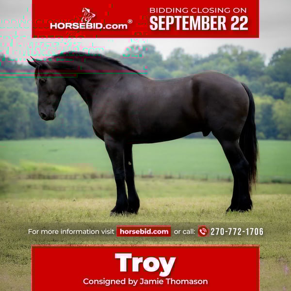 🍁𝒕𝒉𝒆 𝐅𝐀𝐋𝐋 𝑺𝒑𝒆𝒄𝒕𝒂𝒄𝒖𝒍𝒂𝒓🍁 Happening now thru MONDAY | SEPTEMBER 22nd - Available EXCLUSIVELY on HorseBid's website! For more details and to register visit: www.Horsebid.com CONSIGNOR CONTACT: Jamie Thomason 270-772-1706 LOCATION: Auburn, KY BREED: Friesian Heritage Horse REGISTERED: Yes REGISTERED NAME: BIRCH FARM ROCKY COLOR: Black HEIGHT: 17.1 AGE: 5 GENDER: Gelding Add the wow factor to your barn with this breathtaking, jet-black Registered Friesian Heritage Horse! TROY is a 1/2 Friesian, 1/4 Morgan, 1/4 Percheron gelding, standing at 17.1 hands tall. He’s the picture of elegance and presence, yet his quiet, docile demeanor makes him a true pleasure to own. Whether you're in the arena, on the trail, or simply grooming in the barn, this handsome gelding is as steady and kind as they come. A versatile partner, Troy rides English, Western, and drives. His movement is a dream! A floaty trot, balanced, beautiful gaits, and smooth, easy transitions. He’s soft in the bridle, responsive, and offers the perfect combination of whoa and go—easy to adjust to the pace you want without ever being too forward. He picks up a canter from a near standstill and travels on the correct lead in both directions. A fantastic candidate for traditional or Western Dressage. Troy’s not just beautiful in the ring, he’s brave and steady out of it. He’ll quietly hack out alone or in a group, he’s surefooted, crosses water, handles rough terrain with ease, and rides across open pastures. He’s traffic safe, gun safe, unbothered by waving tarps, and proudly carries the flag. Safe and seasoned around kids, dogs, cattle, & other livestock. A true gentleman with perfect barn manners, Troy is polite in the stall or out in the pasture, always easy to catch, stands tied, cross-tied, or ground-tied, and is always respectful on the ground. He’ll stand patiently at the block or the ground for mounting. With just the raise of your hand & snap of your fingers, he’ll side pass to you whether you're on a block, a truck bed, or the fence rail. Troy is sure to be the conversation piece of any barn—always admired, always reliable. If you're looking for a horse that turns heads while keeping a calm, trustworthy heart, your search ends here. Don't miss this rare opportunity to own the horse of a lifetime! If you have any other questions or would like to meet Troy prior to adding him to your family, feel free to reach out. We can assist in arranging transportation to anywhere!