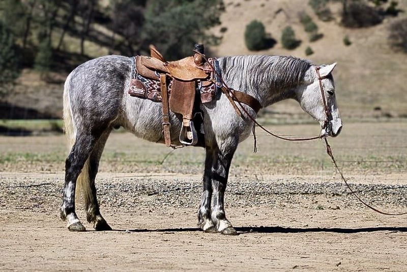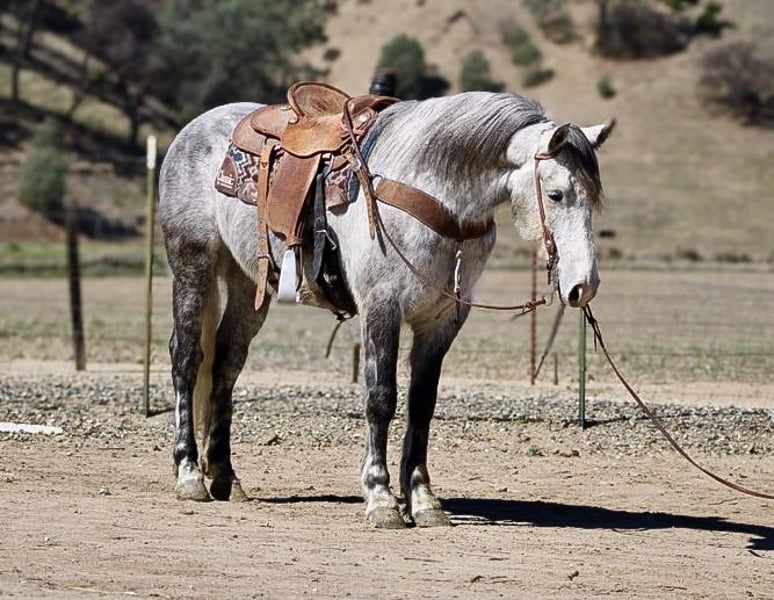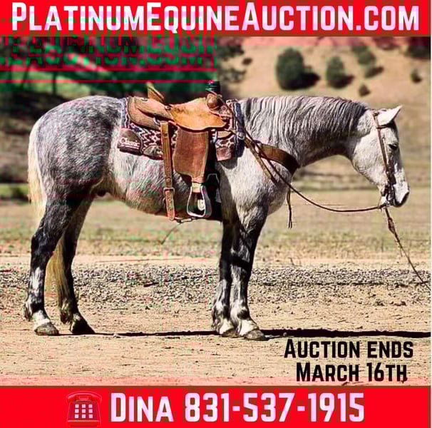 ONLINE AUCTION Place your bids at www.PlatinumEquineAuction.com Starting Bid $3500 Auction ends March 16th, 2025 Need a new saddle? Check out White Rock Saddles on our website or Facebook! Cosmo is a stunning dapple grey draft cross that is waiting to become your new best friend. At 6 years old, standing at 15 hands with a big thick bone and solid foot, he has the perfect combination of beauty and build. It’s impossible not to fall in love with this sweet boy. One of Cosmo’s strongest qualities is his ability to be an excellent trail partner. He navigates any terrain with ease and is sure-footed on even the most challenging trails. Ditches, brush, and wildlife are all just a part of his routine. You can trust him to take you safely up or down any trail without hesitation. In the arena, he has a comfortable trot, smooth lope, and a picture-perfect sliding stop. He has also been introduced to trail obstacles and he confidently tackles bridges, tires, and even walking through a car wash. We have also taken Cosmo out to gather cattle and check pastures. He takes each outing in stride and seems to truly enjoy every adventure we take him on. This friendly horse will meet you at the gate with excitement and loves nothing more than getting pampered especially with belly scratches. Cosmo is an absolute pleasure to handle as well. He stands patiently for clipping and bathing, ties quietly, loads easily into trailers, and hauls like a pro. We have even ridden him down busy streets where he didn’t bat an eye at passing cars or trucks. With his pretty movement, Cosmo would look stunning in English tack too. Whether you’re looking for a reliable trail horse or one that excels in different riding disciplines, this boy is truly versatile. If you want an easy-going horse that anyone can ride, then Cosmo is definitely the rare find you’ve been searching for. He thrives in both pasture settings or stalls; it doesn’t matter to Cosmo as long as he has a loving home. If you’re ready for lifelong adventures with your next equine partner, then Cosmo is the perfect match for you. Please contact us at Longhorn Ranch and ask for Dina at 831-537-1915. We are located in Paicines, California, and would be more than happy to introduce you to this incredible horse. ONLINE AUCTION Place your bids at www.PlatinumEquineAuction.com Starting Bid $3500 Auction ends March 16th, 2025 Need a new saddle? Check out White Rock Saddles on our website or Facebook!