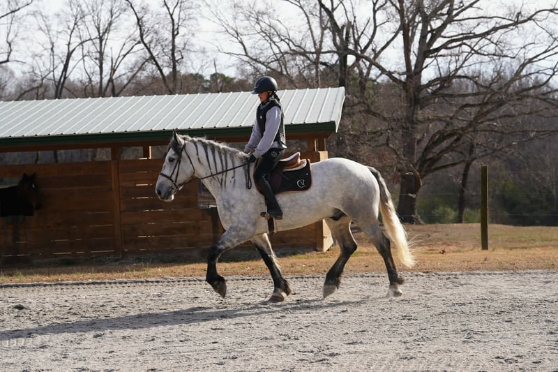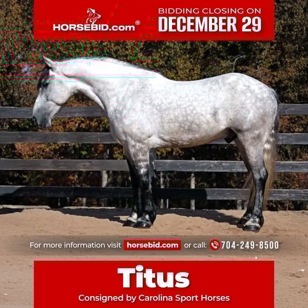 ⚜️ 𝓗𝓮𝓻𝓲𝓽𝓪𝓰𝓮 𝐖𝐢𝐧𝐭𝐞𝐫 𝓒𝓵𝓪𝓼𝓼𝓲𝓬⚜️ Happening now thru MONDAY | DECEMBER 29th - Available EXCLUSIVELY on HorseBid's website! For more details and to register visit: www.Horsebid.com CONSIGNOR CONTACT: Carolina Sport Horses 704-249-8500 LOCATION: Clover, SC BREED: Friesian x Percheron REGISTERED: No REGISTERED NAME: Titus COLOR: Gray HEIGHT: 16.2 AGE: 6 GENDER: Gelding Carolina Sport Horses proudly offers Titus for your consideration. He is one of the most talented Friesian sport horses we have had the pleasure of representing, combining striking beauty with an exceptional mind and genuine athletic ability. At 6 years old he’s over the foolishness of a young horse. His 16.3 frame will carry all sizes of riders! Carolina Sport Horses is widely trusted as a leader in online horse sales because we prioritize quality, transparency, and honest representation. While online auctions are not for everyone, we are committed to making the process comfortable and straightforward. Prospective buyers are always welcome to visit our farm to meet Titus in person, and a current veterinary evaluation is on file and available to review. Titus is a safe, honest, and willing partner who truly excels across disciplines. He is confident and capable in the arena, bold and balanced cross-country, and a natural fit for fox hunting and hunter paces. With his athleticism, reliability, and presence, Titus is a rare offering—ready to move forward confidently in any direction his next partner chooses. Contact us at 704-249-8500