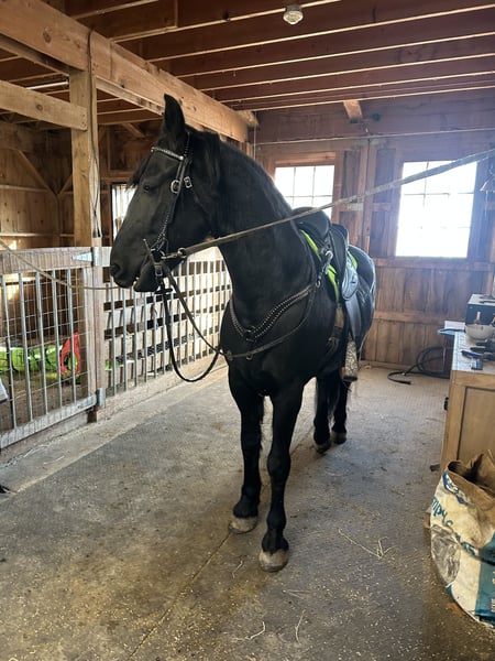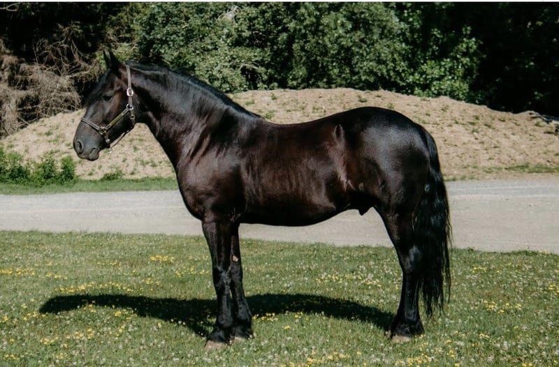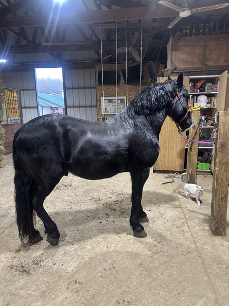 "AVAILABLE ON ONLINE HORSE AUCTION AT www DOT MagicHorseAuction DOT com BIDDING OPEN NOW thru TUESDAY |February 17th! - BUY IT NOW AVAILABLE! *Final price will be determined on auction site* CONSIGNOR CONTACT INFO: Cindy Schie #716-200-2937 LOCATION: Akron, NY" Onyx also known as Blackhawk is a 6-year-old registered Friesian/Pony gelding standing at 14.1hh. Well, broke to ride and drive. Rides both English and Western. Amazing arena horse! Lopes a circle nicely. Picks up walk, trot, and canter easily. Leg yields. Does great on obstacle courses.. Stands quietly and patiently at a mounting block. Stops and stands when asked. Picks up both leads correctly. Blackhawk would be a nice dressage prospect. Blackhawk has also been used on the farm. He has been on trails and will cross creeks, step over logs with ease, and climb any hill you ask him to. He does fine out in groups or out alone. He is traffic safe and will stand patiently while at stop signs. This pretty gelding also has excellent ground manners and has the sweetest personality. He is easy to catch in the stall and outside. Ties nicely on a lead line and in cross ties. He is easy to handle, even the kids can groom, tack, and get him ready to ride with no help from an adult. He stands well for the farrier and vet. Blackhawk loads well and remains quiet during hauling. He has a super sweet attitude and loves attention! Blackhawk sells a 100% sound with x-rays and PPE! Contact Cindy at 716-200-2937 for more information! Located in Akron,NY