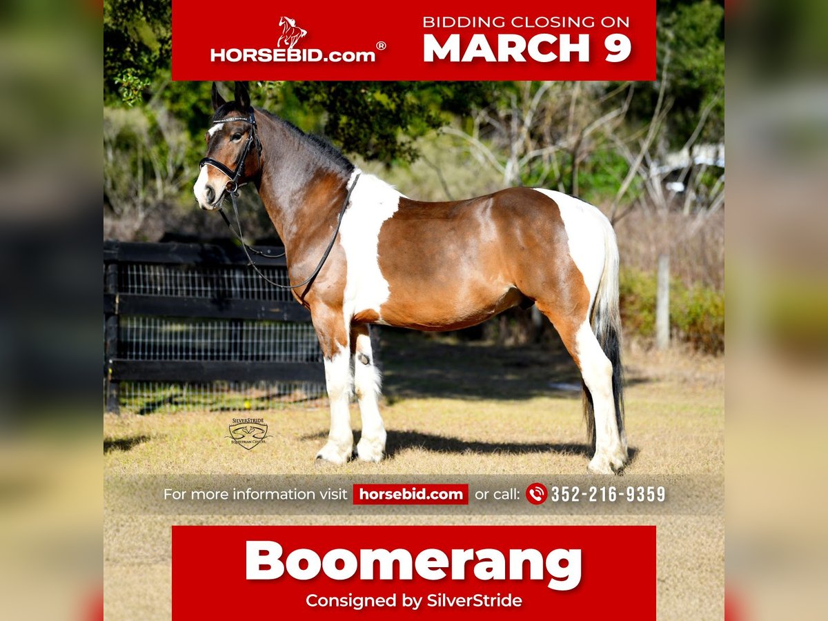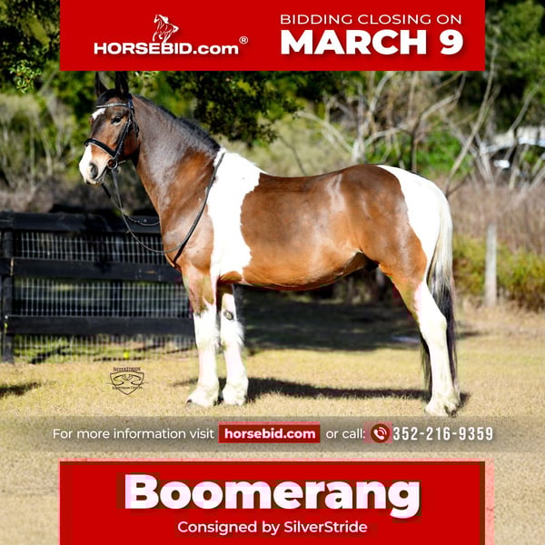 ℳ𝒶𝓇𝒸𝒽 ♦️𝐑𝐈𝐃𝐄𝐑'𝐒 𝐂𝐇𝐎𝐈𝐂𝐄♦️ Happening now thru MONDAY | MARCH 9th - Available EXCLUSIVELY on HorseBid's website! For more details and to register visit: www.Horsebid.com CONSIGNOR CONTACT: SilverStride 352-216-9359 LOCATION: Ocala, FL BREED: Friesian/warmblood/pinto cross REGISTERED: No REGISTERED NAME: Boomerang COLOR: Bay, white, black HEIGHT: 15.2 AGE: 8 GENDER: Gelding Boomerang is a super talented 8 year old pinto cross looking for his person to take him the next step. This boy is flashy, level headed, sweet, and a joy to work with. He is currently schooling low level dressage, jumping 2ft3 / some 2ft6 showing plenty of scope for more, and dabbling in a bit of everything in between. He has schooled off property on several adventures, gone cross country, trail ridden up north extensively in his previous home, hacks out together or alone. Boom Boom is an all around guy that could go in any direction. He is currently ridden by a junior/ young rider who has been bringing him along beautifully. He is easy enough for an adult amateur or junior to continue his journey. Boom Boom is a sweetheart on the ground who enjoys being groomed and doted on. He is sound, solid, and a lovely citizen to have in the barn. He is barefoot and an easy keeper. No maintenance, vices, or issues. He has clean Xrays on file and is update to date on everything ready to ship your way. Ocala, fl.